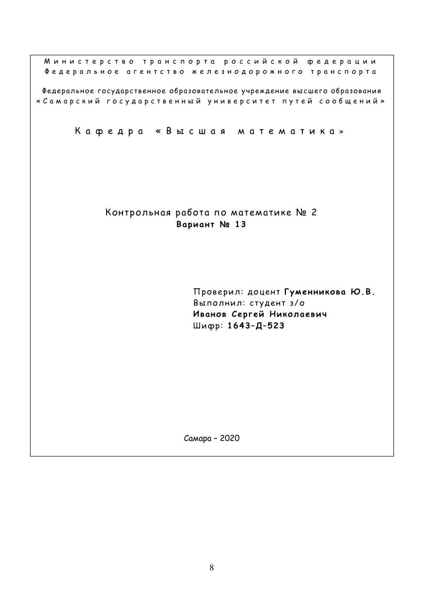 Пособие составлено в соответствии с ФГОС ВО, рабочей программой дисциплины и курсом лекций, читаемых по дисциплине «Математика» и направлен на овладение основными понятиями дисциплины, позволяющими использовать математический аппарат для решения теоретиче-ских и практических задач, решать типовые задачи, владеть навыками работы со специальной математической литературой. Пособие предназначено для обучающихся по направлению подго-товки 23.05.04 Эксплуатация железных дорог, профиль «Магистральный транспорт» заочной формы обучения.
