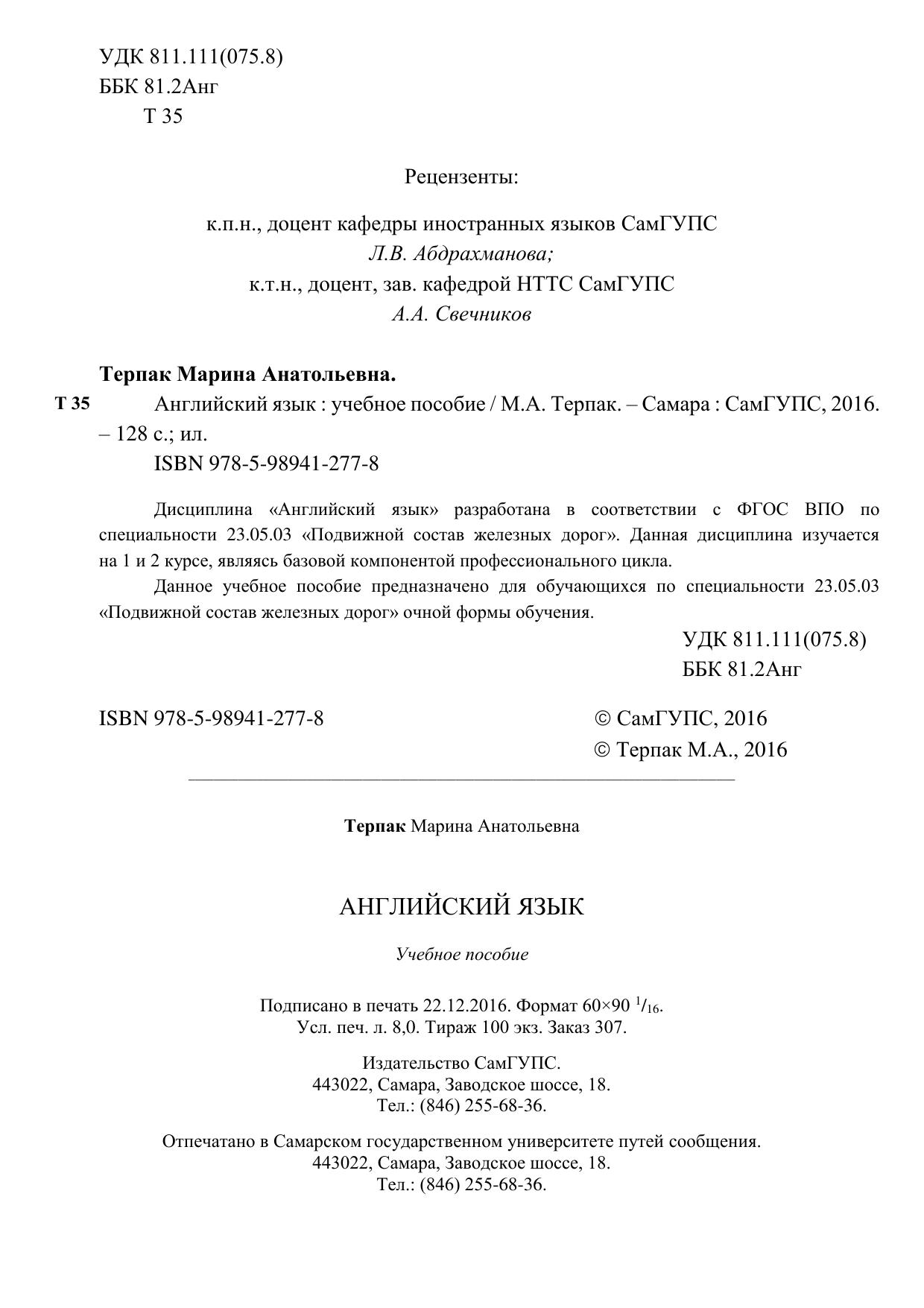 Терняк, М.А. Английский язык : учебное пособие / М. А. Терняк. — Самара : СамГУПС, 2016. — 128 с. — 978-5-98941-277-8. — Текст : электронный // УМЦ ЖДТ : электронная библиотека. — URL: https://umczdt.ru/books/1064/263249/ (дата обращения 22.04.2026). — Режим доступа: по подписке.