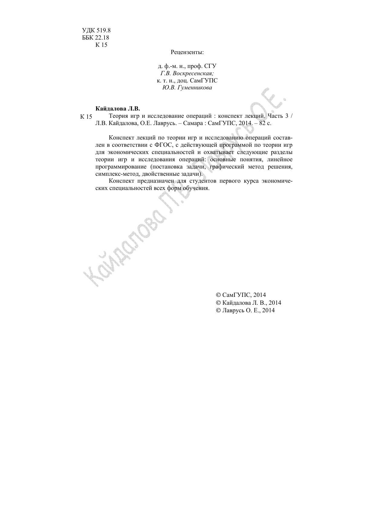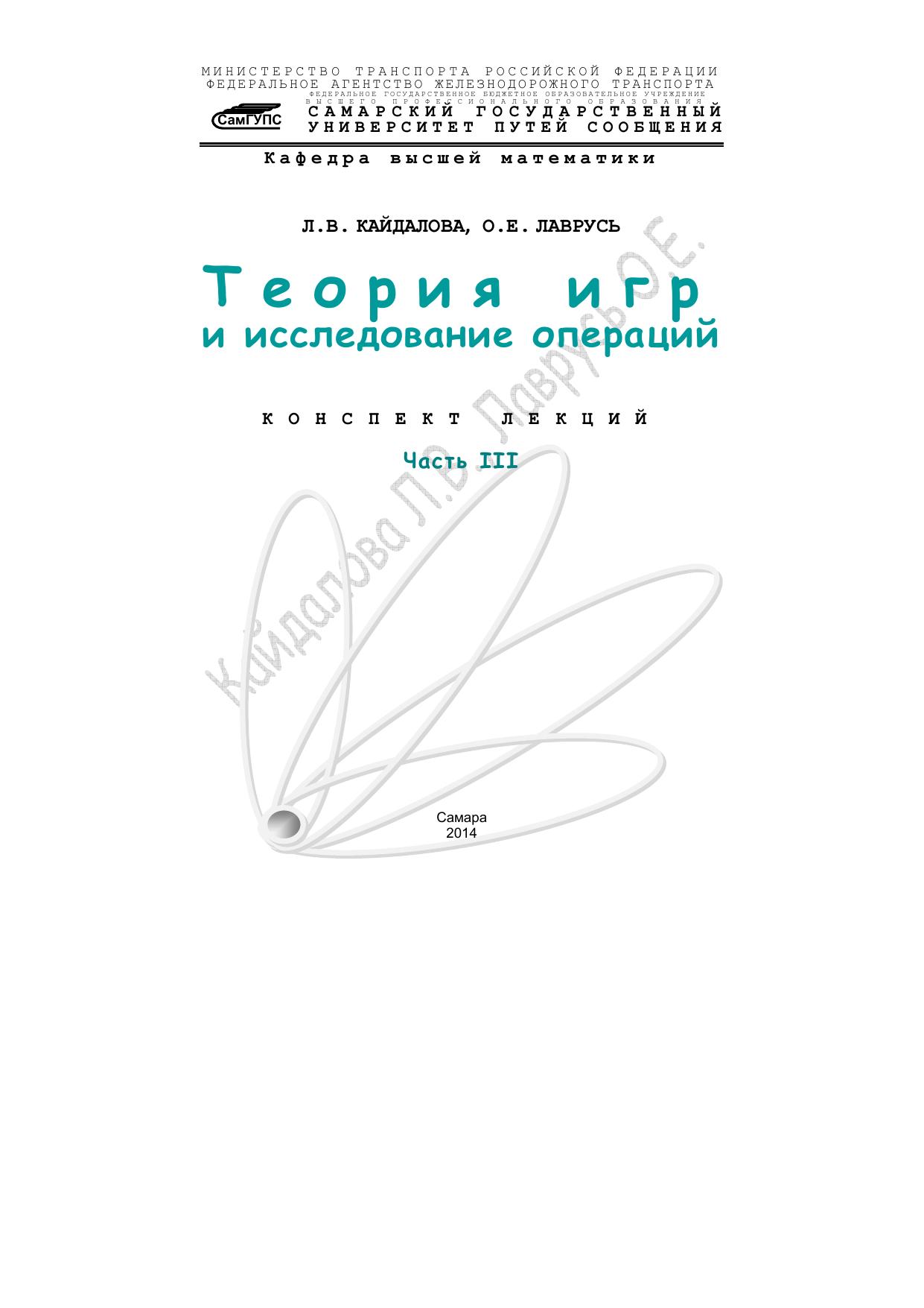 Кайдалова, Л.В. Теория игр и исследование операций. Часть 3 : конспект лекций / Л. В. Кайдалова, О. Е. Лаврусь. — Самара : СамГУПС, 2014. — 82 с. — Текст : электронный // УМЦ ЖДТ : электронная библиотека. — URL: https://umczdt.ru/books/1071/263574/ (дата обращения 21.01.2026). — Режим доступа: по подписке.