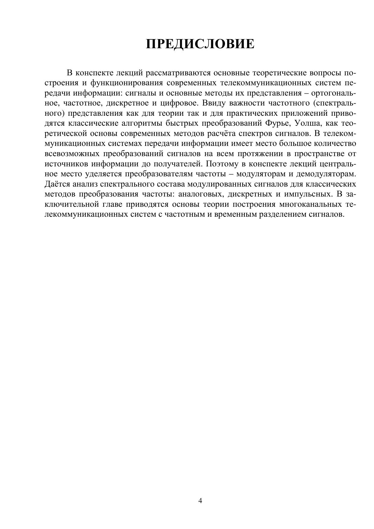 Приведена классификация и основные методы представления сигналов. Изложены классические алгоритмы быстрого преобразования Фурье, являющиеся основным математическим аппаратом оценки спектра сигналов связи. Приведены основные виды преобразований сигналов в современных телекоммуникационных системах.  Рассмотрены основы передачи сообщений по многоканальным системам. Предназначено для студентов электротехнического факультета СамГУПС, обучащихся по специальности «Информационные системы и технологии» и изучающих дисциплины «Теоретические основы информационных процессов и систем», «Системы и сети передачи данных» в рамках лекционных, лабораторных, практических занятий и выполняющих курсовой проект по синтезу цифровой телекоммуникационной системы. Разработано на кафедре информационных систем и телекоммуникаций. Может быть полезно студентам, обучающимся по направлениям «Информационные системы» и «Информатика и вычислительная техника».