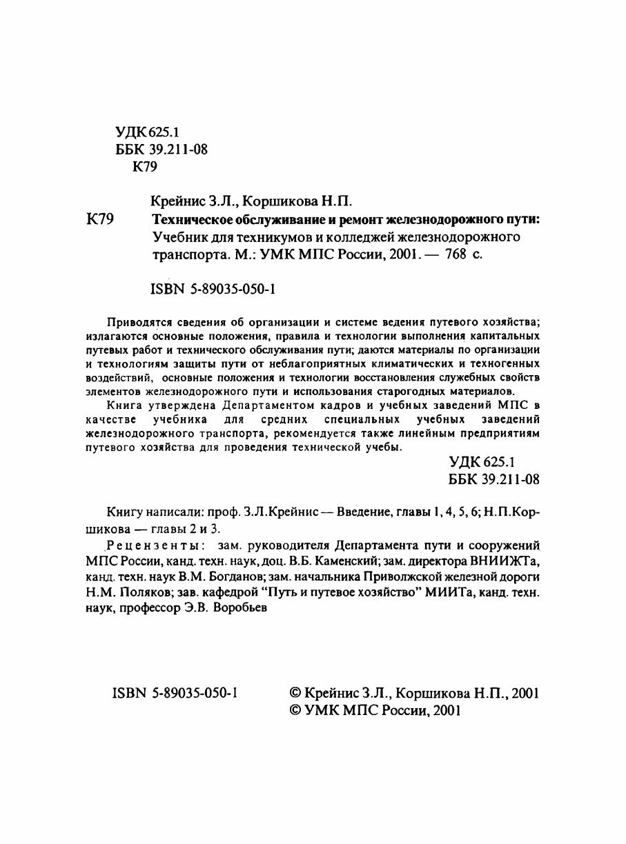Книга утверждена Департаментом кадров и учебных заведений МПС в качестве учебника для средних специальных учебных заведений железнодорожного транспорта, рекомендуется также линейным предприятиям путевого хозяйства для проведения технической учебы.