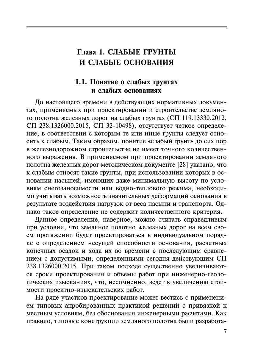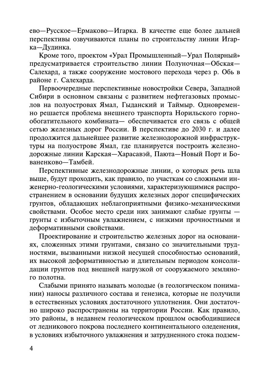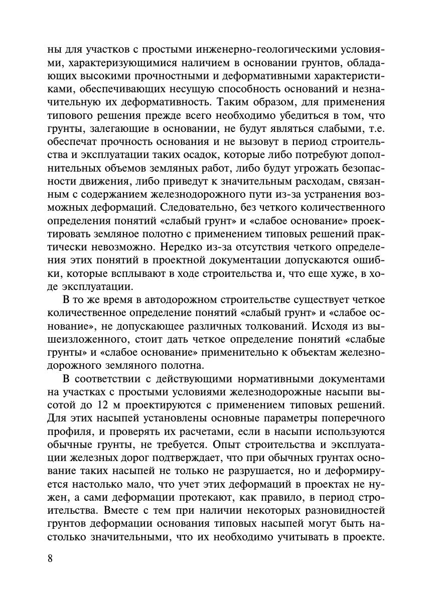 Рассмотрены вопросы проектирования и строительства железных дорог в особых инженерно-геологических условиях: на торфах, отложениях органических и минеральных илов, неуплотненных водонасыщенных глинах. Недостаточная несущая способность, высокая сжимаемость и другие особенности слабых водонасыщенных грунтов создают существенные технические трудности и требуют крупных материальных затрат при строительстве железных дорог. На основе обобщения опыта проектирования и строительства железных дорог на слабых грунтах в пособии приведены методы расчета слабых оснований, даны предложения по обеспечению прочности, устойчивости земляного полотна, а также снижению его деформативности в ходе эксплуатации.