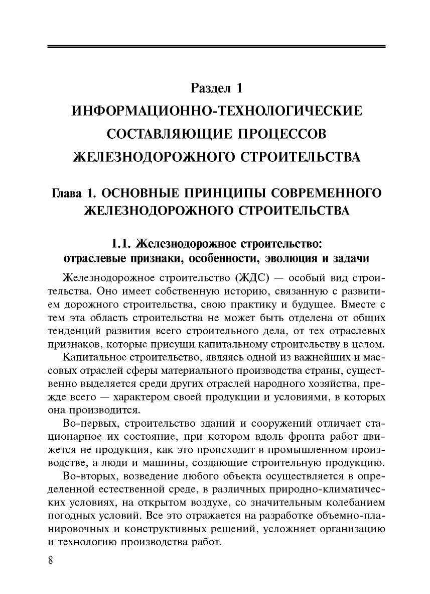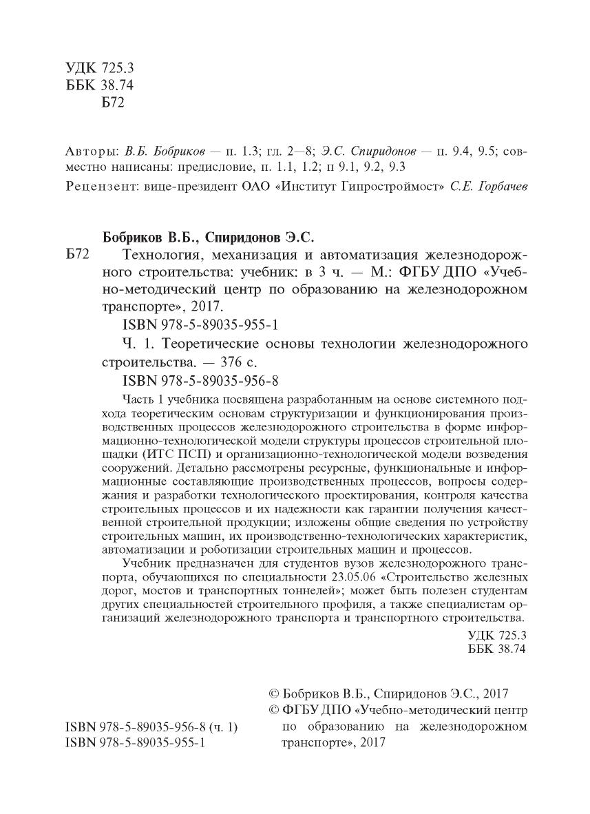 Часть 1 учебника посвящена разработанным на основе системного подхода теоретическим основам структуризации и функционирования производственных процессов железнодорожного строительства в форме информационно-технологической модели структуры процессов строительной площадки (ИТС ПСП) и организационно-технологической модели возведения сооружений. Детально рассмотрены ресурсные, функциональные и информационные составляющие производственных процессов, вопросы содержания и разработки технологического проектирования, контроля качества строительных процессов и их надежности как гарантии получения качественной строительной продукции; изложены общие сведения по устройству строительных машин, их производственно-технологических характеристик, автоматизации и роботизации строительных машин и процессов.