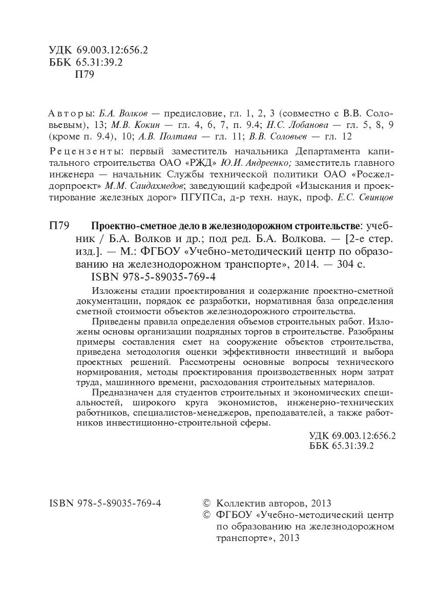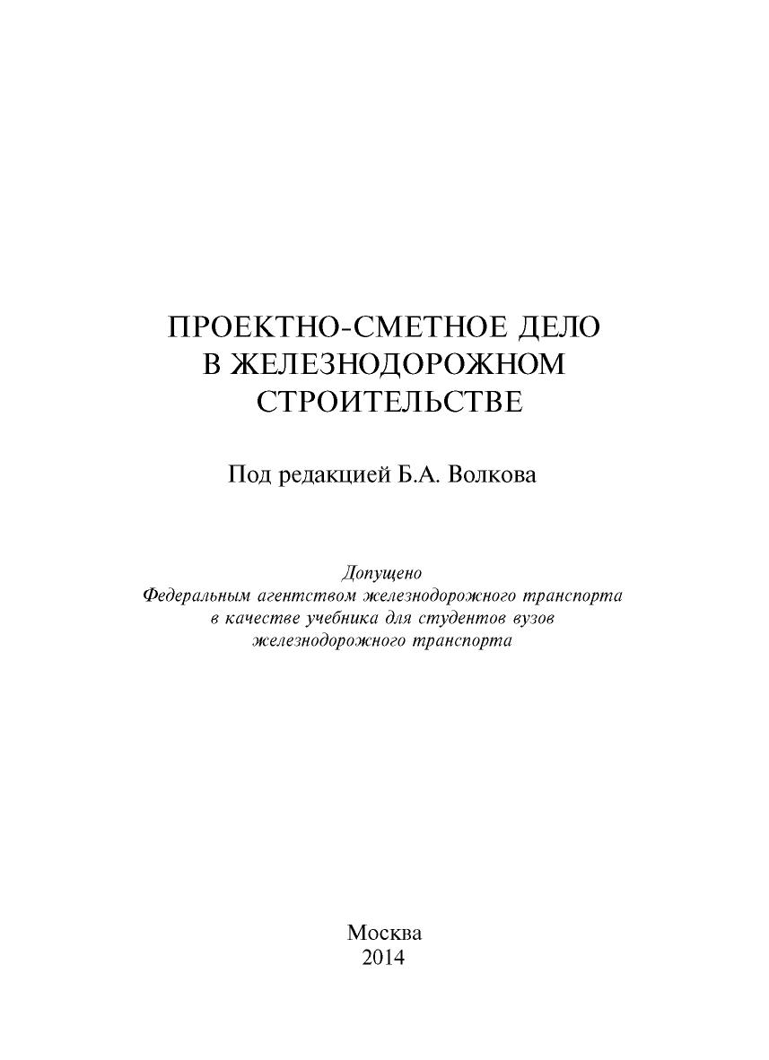Волков, Б.А. Проектно-сметное дело в железнодорожном строительстве : учебник / Б. А. Волков, М. В. Кокин, Н. С. Лобанова, А. В. Полтава, В. В. Соловьев. — Москва : ФГБОУ «Учебно-методический центр по образованию на железнодорожном транспорте», 2013. — 304 с. — 978-5-89035-769-4. — Текст : электронный // УМЦ ЖДТ : электронная библиотека. — URL: https://umczdt.ru/books/1193/2601/ (дата обращения 19.04.2026). — Режим доступа: по подписке.