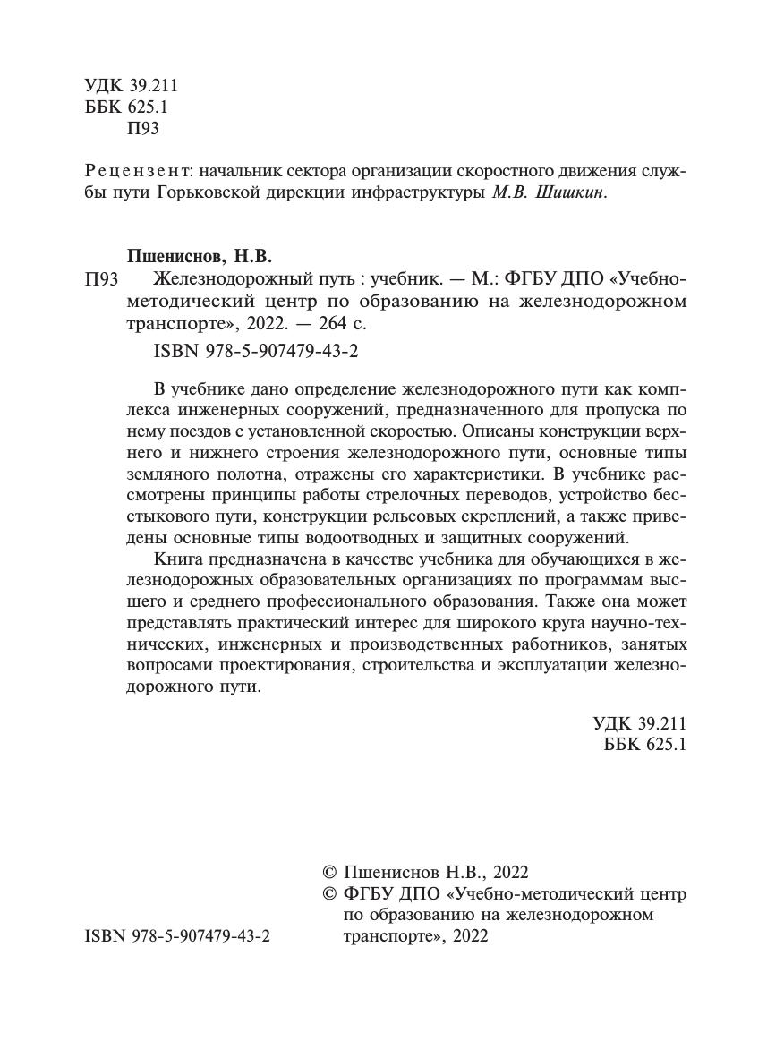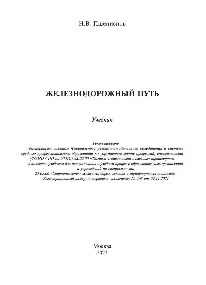 Пшениснов, Н.В. Железнодорожный путь : учебник / Н. В. Пшениснов. — Москва : УМЦ ЖДТ, 2022. — 264 с. — 978-5-907479-43-2. — Текст : электронный // УМЦ ЖДТ : электронная библиотека. — URL: https://umczdt.ru/books/1193/260708/ (дата обращения 20.04.2026). — Режим доступа: по подписке.