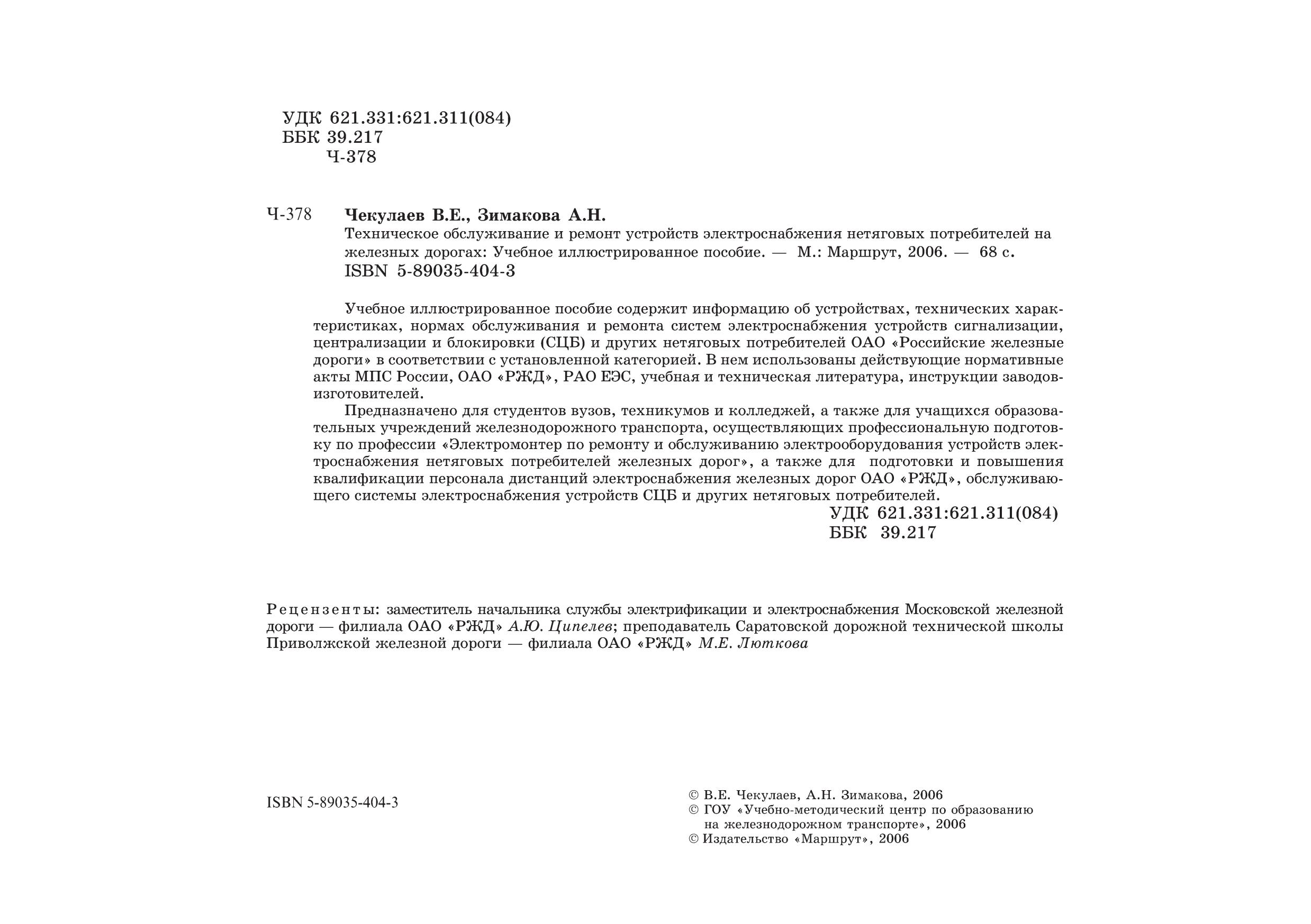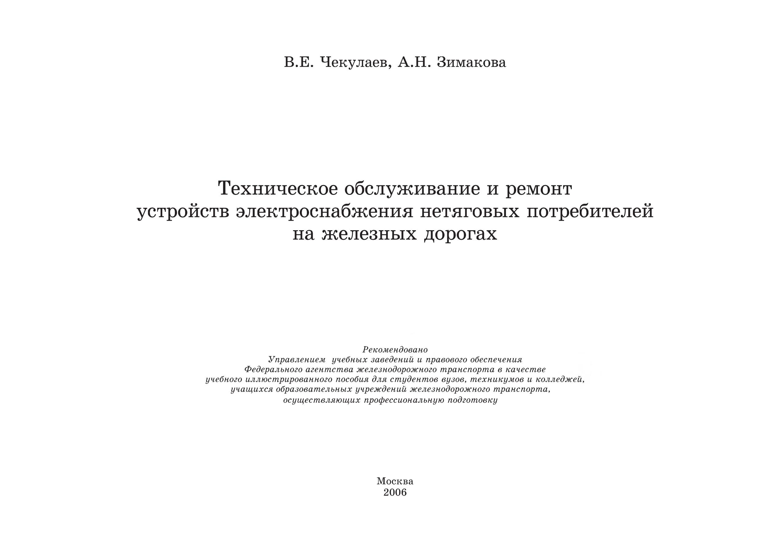 Чекулаев, В.Е. Техническое обслуживание и ремонт устройств электроснабжения нетяговых потребителей на железных дорогах. : учебное пособие / В. Е. Чекулаев, А. Н. Зимакова. — Москва : Издательство "Маршрут", 2006. — 68 с. — 5-89035-404-3. — Текст : электронный // УМЦ ЖДТ : электронная библиотека. — URL: https://umczdt.ru/books/1194/226122/ (дата обращения 30.04.2026). — Режим доступа: по подписке.