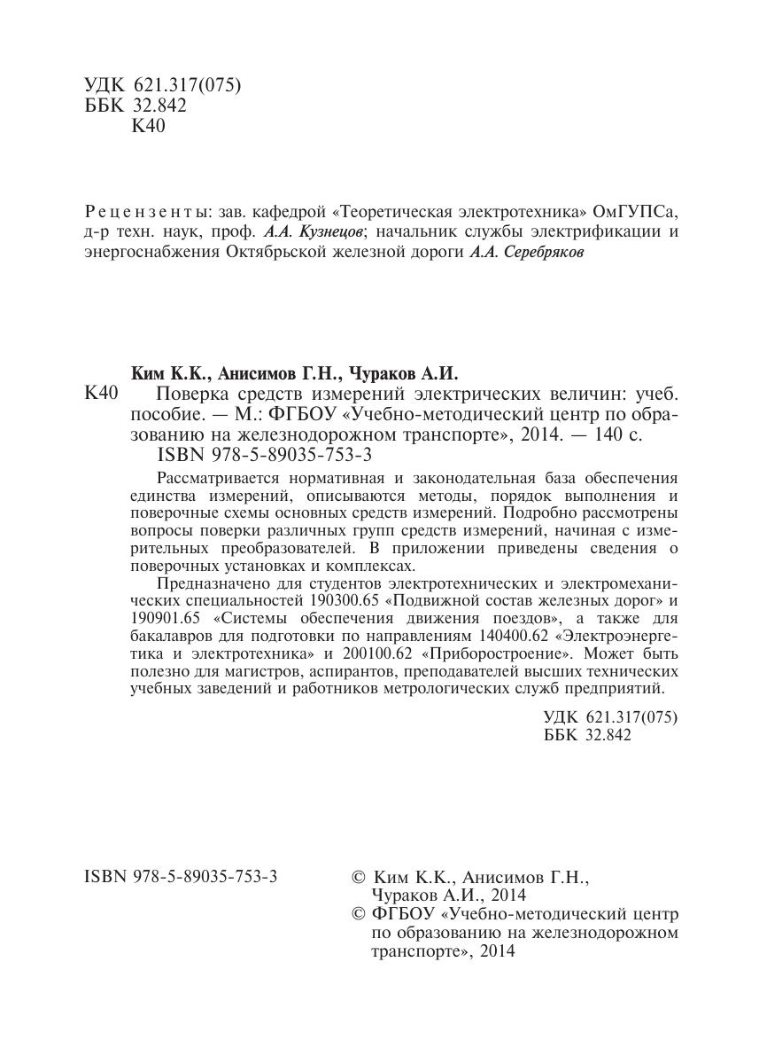Предназначено для студентов электротехнических и электромеханических специальностей 190300.65 «Подвижной состав железных дорог» и 190901.65 «Системы обеспечения движения поездов», а также для бакалавров для подготовки по направлениям 140400.62 «Электроэнергетика и электротехника» и 200100.62 «Приборостроение». Может быть полезно для магистров, аспирантов, преподавателей высших технических учебных заведений и работников метрологических служб предприятий.