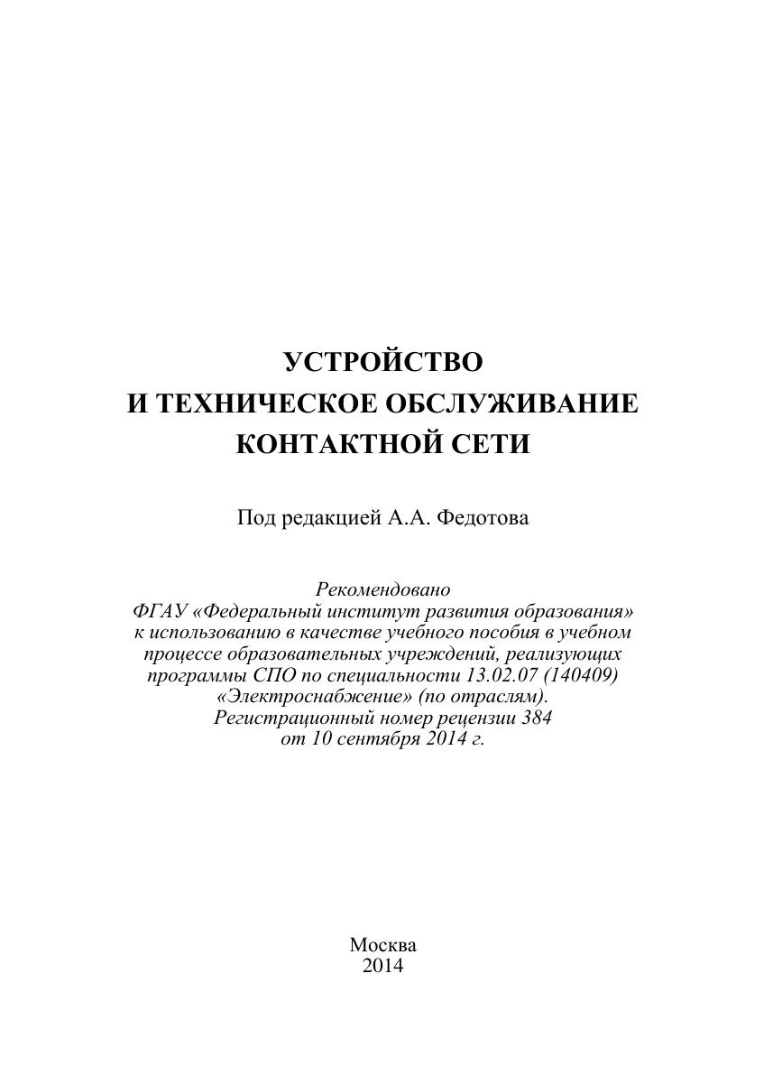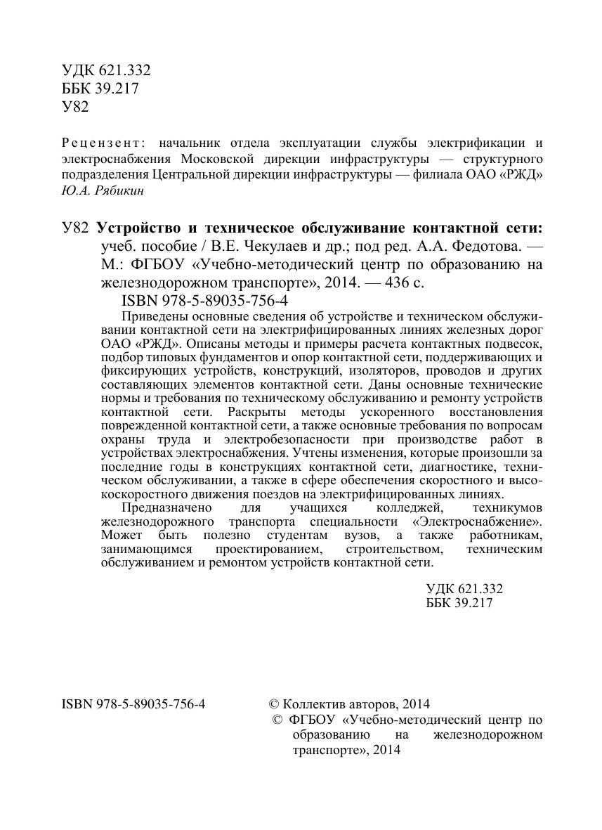 Приведены основные сведения об устройстве и техническом обслуживании контактной сети на электрифицированных линиях железных дорог ОАО «РЖД». Описаны методы и примеры расчета контактных подвесок, подбор типовых фундаментов и опор контактной сети, поддерживающих и фиксирующих устройств, конструкций, изоляторов, проводов и других составляющих элементов контактной сети. Даны основные технические нормы и требования по техническому обслуживанию и ремонту устройств контактной сети. Раскрыты методы ускоренного восстановления поврежденной контактной сети, а также основные требования по вопросам охраны труда и электробезопасности при производстве работ в устройствах электроснабжения. Учтены изменения, которые произошли за последние годы в конструкциях контактной сети, диагностике, техническом обслуживании, а также в сфере обеспечения скоростного и высокоскоростного движения поездов на электрифицированных линиях.