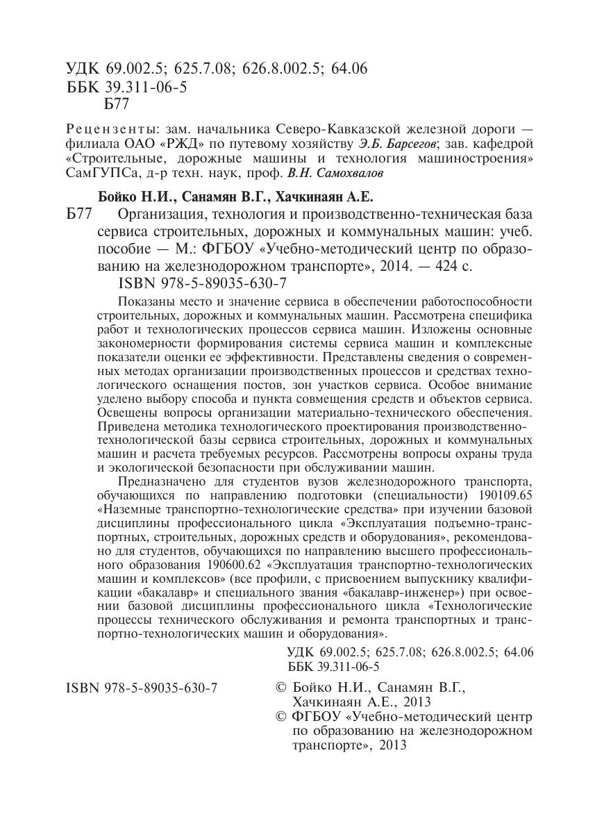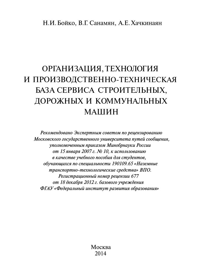 Бойко, Н.И. Организация, технология и производственно- техническая база сервиса строительных, дорожных и коммунальных машин : учебное пособие / Н. И. Бойко, В. Г. Санамян, А. Е. Хачкинаян. — Москва : ФГБОУ «Учебно-методический центр по образованию на железнодорожном транспорте», 2014. — 424 с. — 978-5-89035-630-7. — Текст : электронный // УМЦ ЖДТ : электронная библиотека. — URL: https://umczdt.ru/books/1195/2518/ (дата обращения 23.01.2026). — Режим доступа: по подписке.