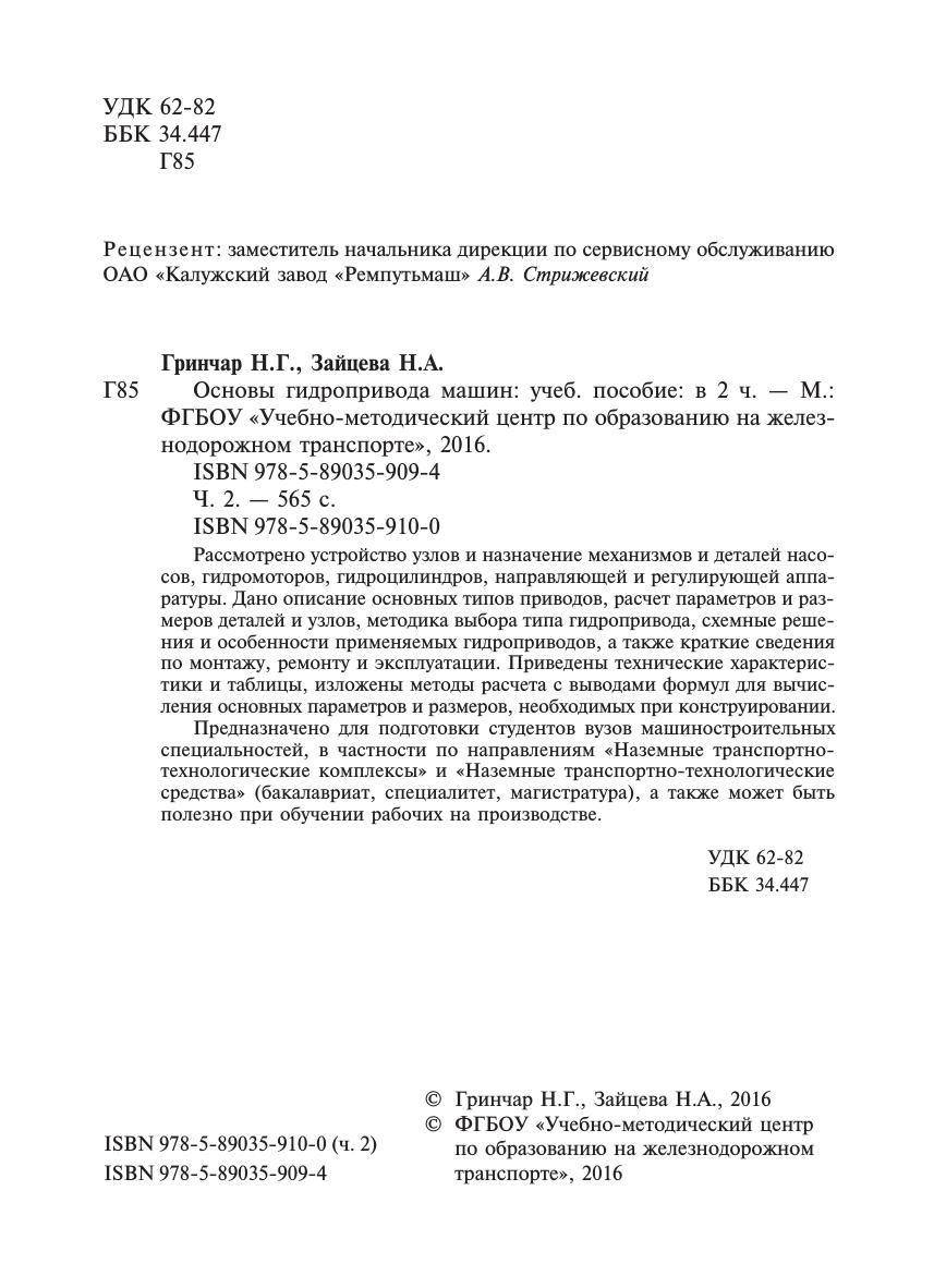 Рассмотрено устройство узлов и назначение механизмов и деталей насосов, гидромоторов, гидроцилиндров, направляющей и регулирующей аппаратуры. Дано описание основных типов приводов, расчет параметров и размеров деталей и узлов, методика выбора типа гидропривода, схемные решения и особенности применяемых гидроприводов, а также краткие сведения по монтажу, ремонту и эксплуатации. Приведены технические характеристики и таблицы, изложены методы расчета с выводами формул для вычисления основных параметров и размеров, необходимых при конструировании. Предназначено для подготовки студентов вузов машиностроительных специальностей, в частности по направлениям «Наземные транспортно- технологические комплексы» и «Наземные транспортно-технологические средства» (бакалавриат, специалитет, магистратура), а также может быть полезно при обучении рабочих на производстве.