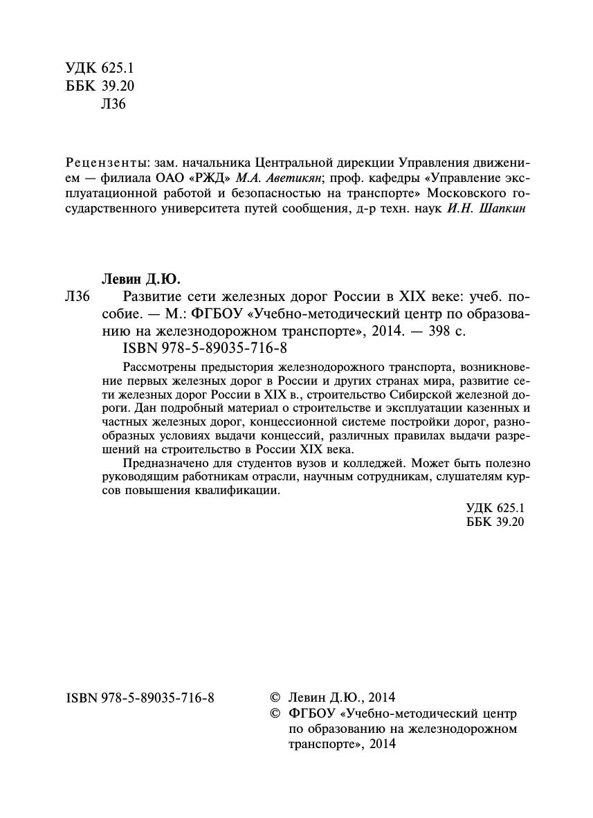 Рассмотрены предыстория железнодорожного транспорта, возникновение первых железных дорог в России и других странах мира, развитие сети железных дорог России в XIX в., строительство Сибирской железной дороги. Дан подробный материал о строительстве и эксплуатации казенных и частных железных дорог, концессионной системе постройки дорог, разнообразных условиях выдачи концессий, различных правилах выдачи разрешений на строительство в России XIX века. Предназначено для студентов вузов и колледжей. Может быть полезно руководящим работникам отрасли, научным сотрудникам, слушателям курсов повышения квалификации.