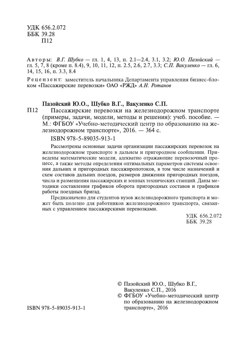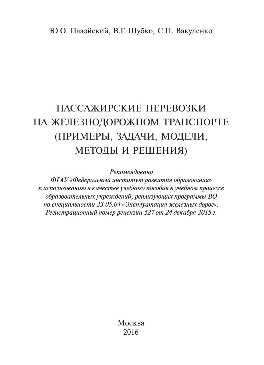 Пазойский, Ю.О. Пассажирские перевозки на железнодорожном транспорте (примеры, задачи, модели, методы, решения) : учебное пособие / Ю. О. Пазойский, В. Г. Шубко, С. П. Вакуленко. — Москва : ФГБОУ «Учебно-методический центр по образованию на железнодорожном транспорте», 2016. — 364 с. — 978-5-89035-913-1. — Текст : электронный // УМЦ ЖДТ : электронная библиотека. — URL: https://umczdt.ru/books/1196/39302/ (дата обращения 22.01.2026). — Режим доступа: по подписке.