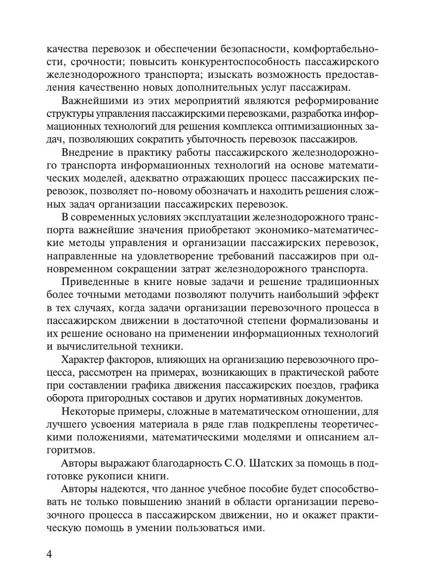 также методы определения оптимальных параметров системы освоения дальних и пригородных пассажиропотоков, в том числе назначений и схем составов дальних поездов, размеров движения пригородных поездов, числа и размещения пассажирских и зонных технических станций. Даны методики составления графиков оборота пригородных составов и графиков работы поездных бригад.