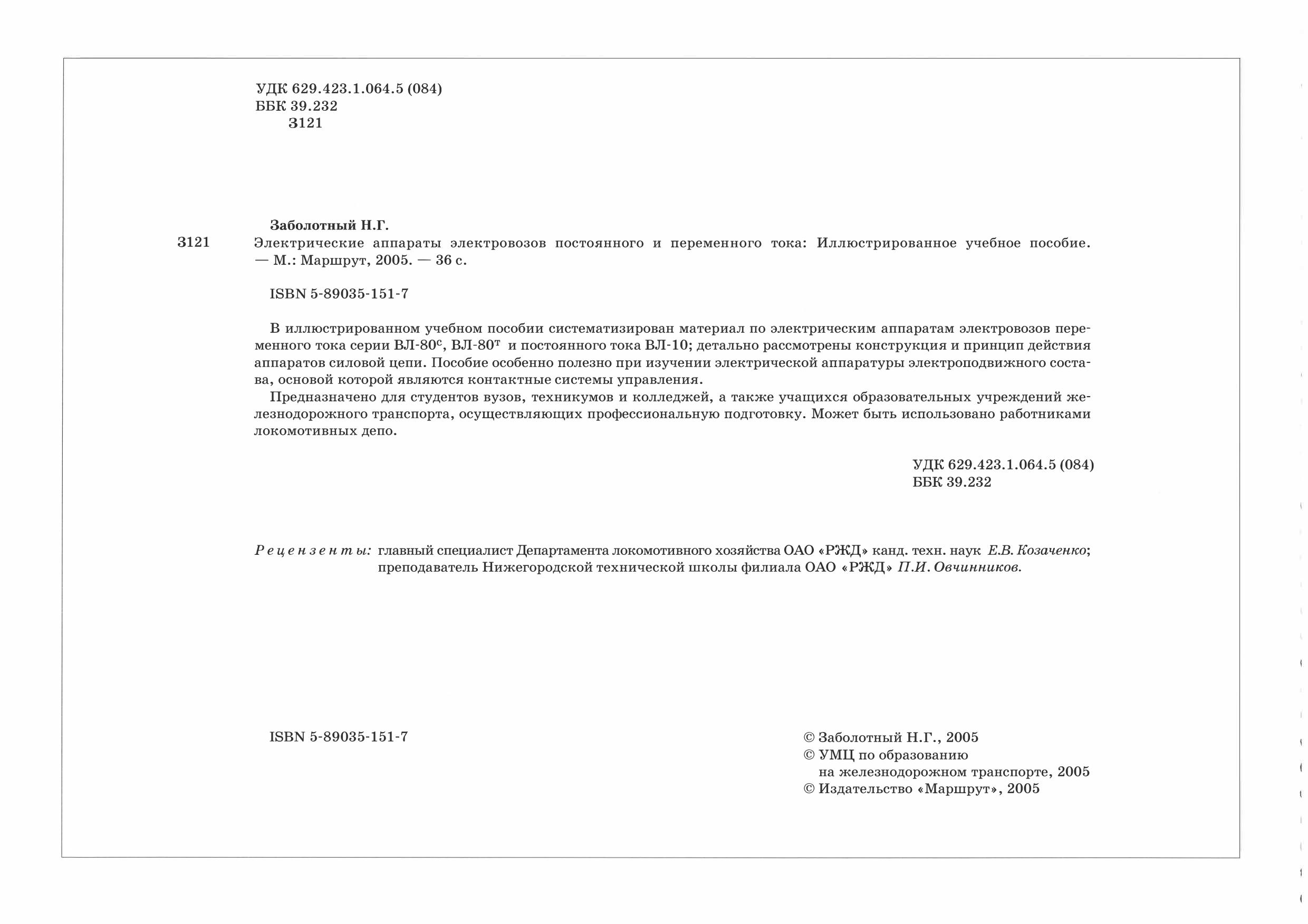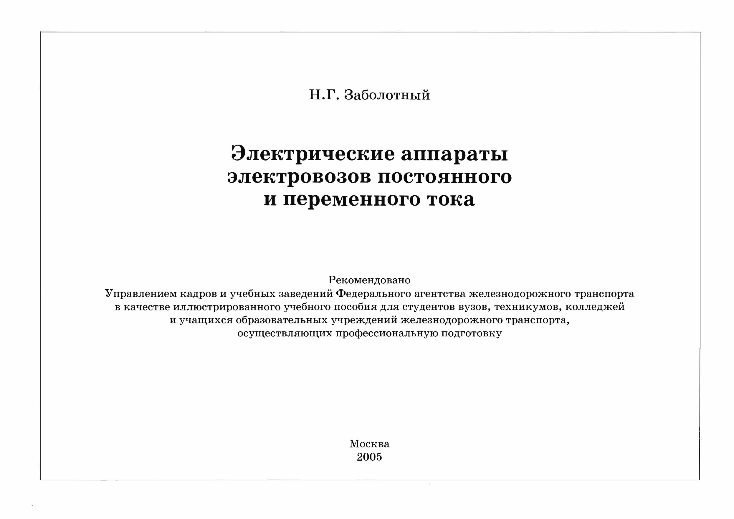 Заболотный, Н.Г. Электрические аппараты электровозов постоянного и переменного тока : учебное пособие / Н. Г. Заболотный. — Москва : Издательство "Маршрут", 2005. — 36 с. — 5-89035-151-7. — Текст : электронный // УМЦ ЖДТ : электронная библиотека. — URL: https://umczdt.ru/books/1200/223430/ (дата обращения 21.04.2026). — Режим доступа: по подписке.