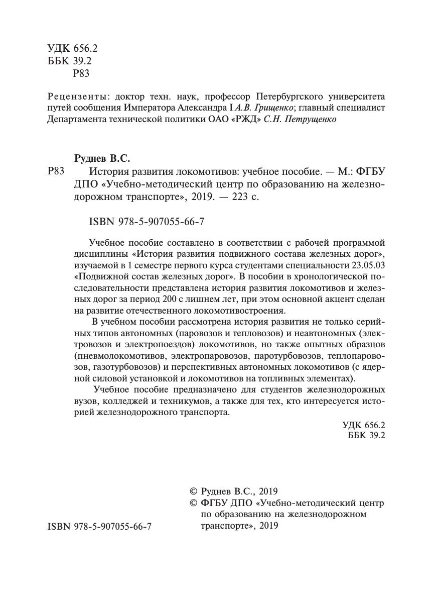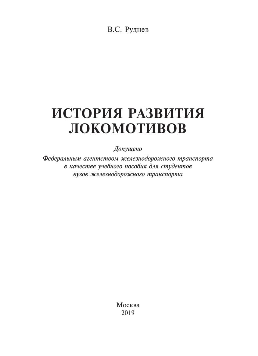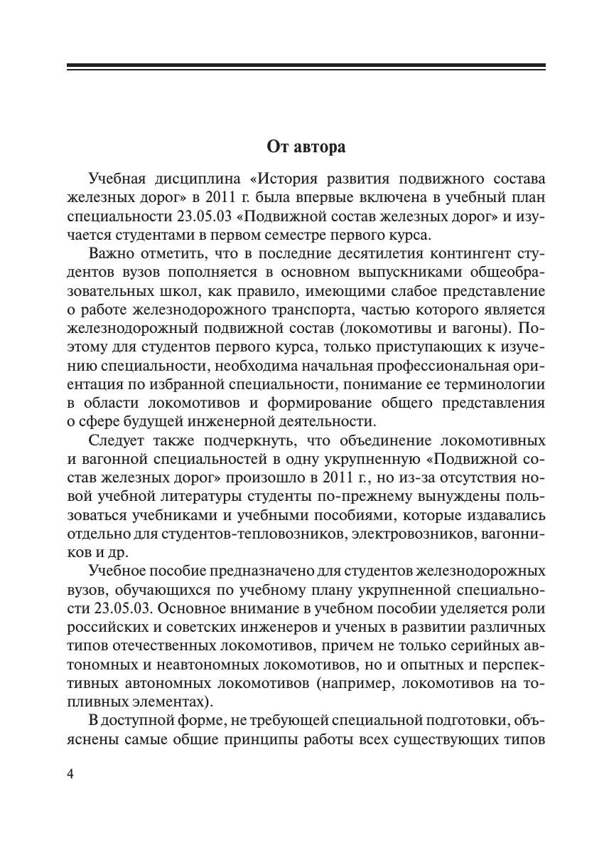 Учебное пособие составлено в соотвествии с рабочей программой дисциплины " История развития подвижного состава железных дорог" изучаемой в 1 семестре первого курса студентами специальности 23.05.03 "Подвижной состав железных дорог". В пособии в хронологической последовательности представлена история развития локомотивов и железных дорог за период 200 с лишнем лет, при этом основной акцент сделан на развитие отечественного локомотивостроения. В учебном пособии рассмотрена история развития не только серийных типов автономных (паравозов и тепловозов) и неавтномных (электровозов и электропоездов) локомотивов, но также оптынх образцов (пневмолокомотивов, электропаровозов, паротурбовозов,теплопаровозов,газотурбовозов) и перспективных автономных локомотивов ( с ядерной силовой установкой и локомотивов на топливных элементах.