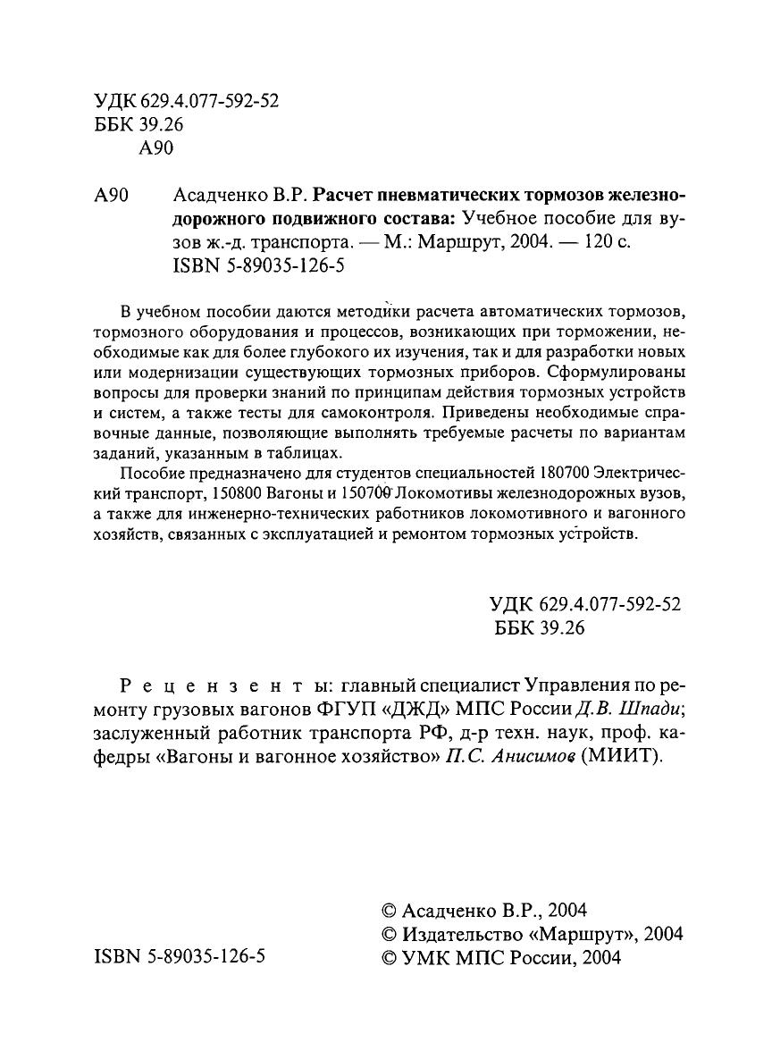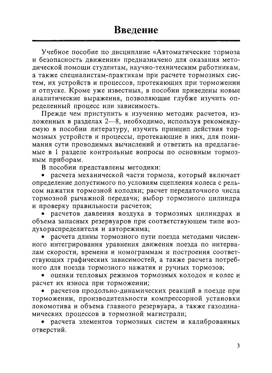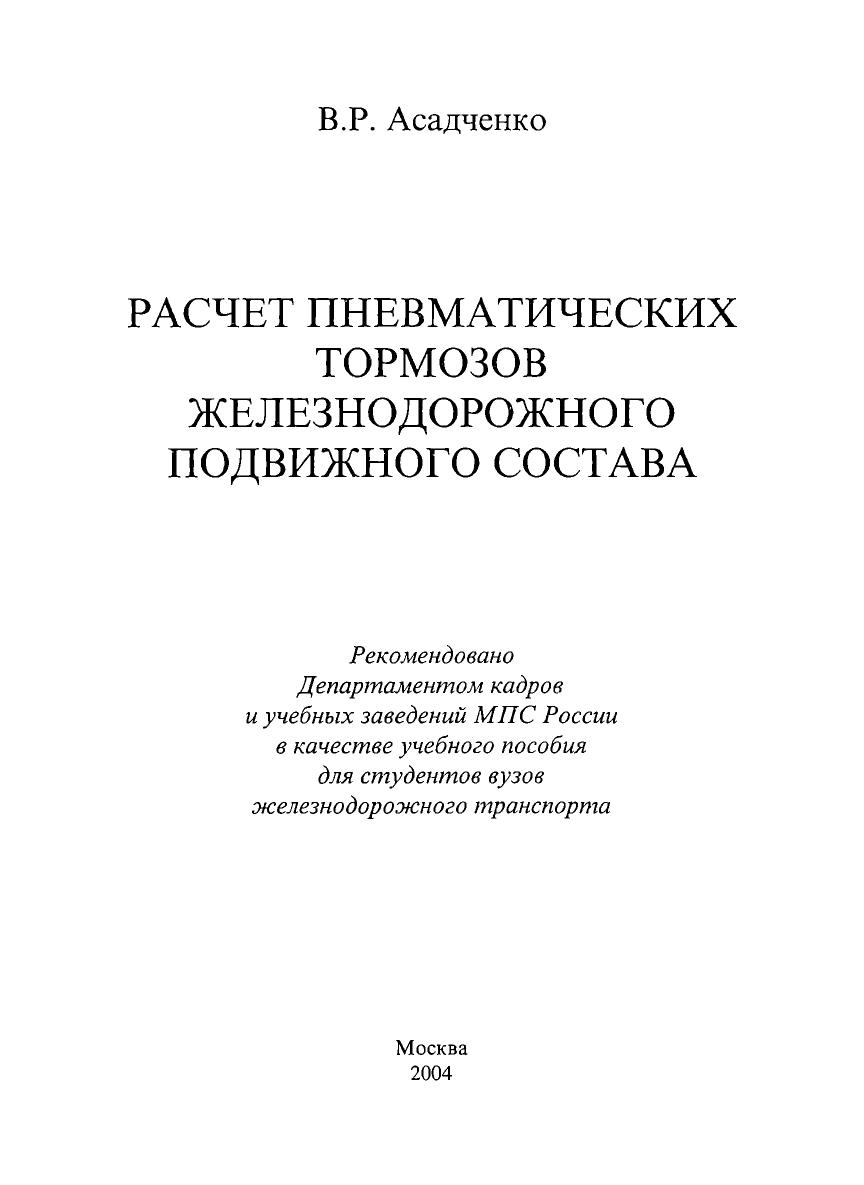 В учебном пособии даются методн.ки расчета автоматических тормозов, тормозного оборудования и процессов, возникающих при торможении , необходимые как для более глубокого их изучения, так и для разработки новых