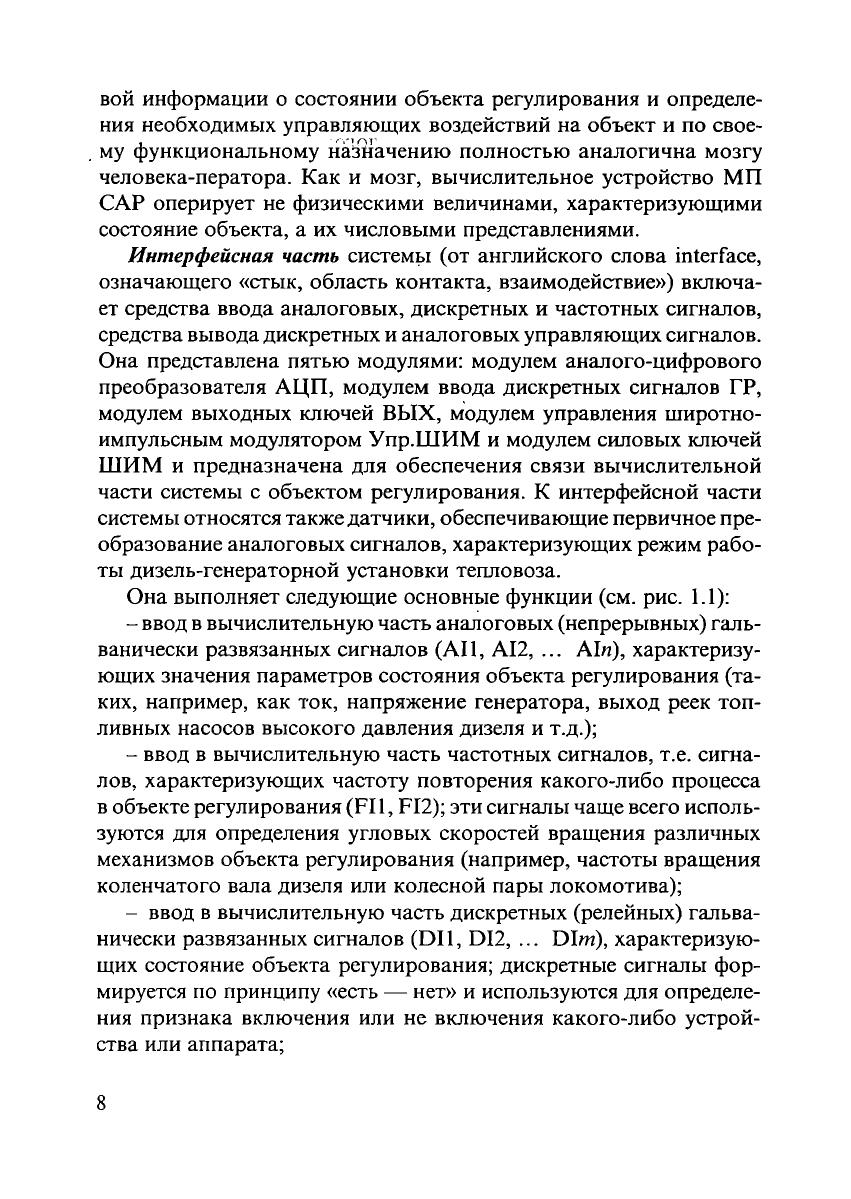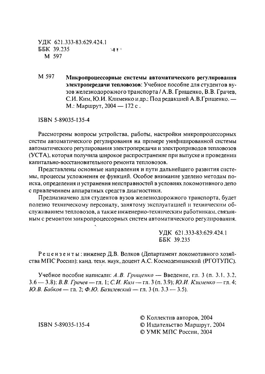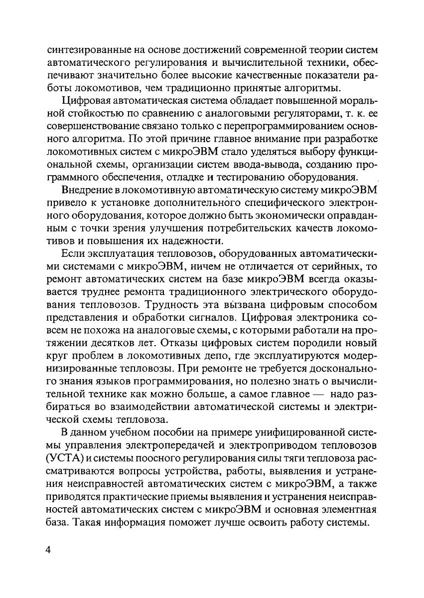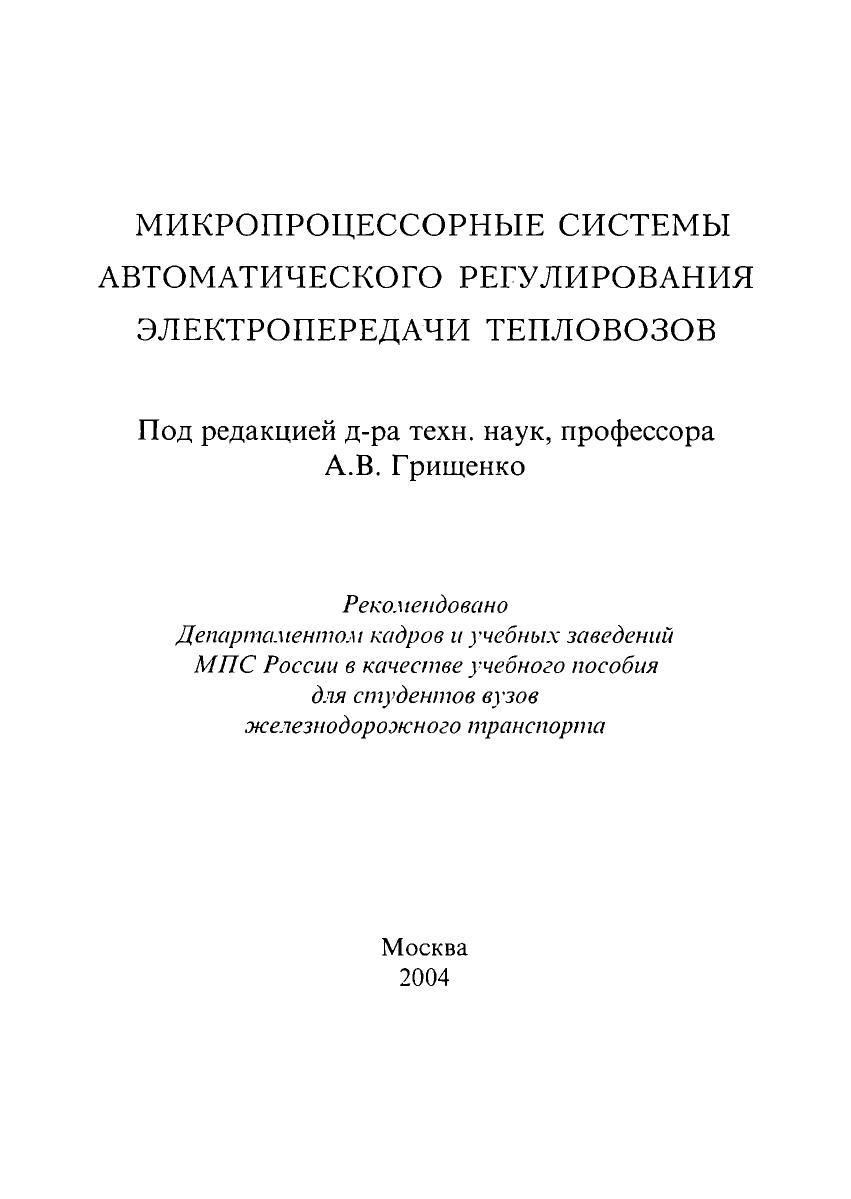 В учебном пособии рассмотрены устройство, работа и способы настройки микропроцессорных систем автоматического регулирования на примере унифицированной системы автоматического регулирования электропередачи и электроприводов тепловозов (УСТА), которая получила широкое распространение при выпуске и проведении капитально-34 35 восстановительного ремонта тепловозов. Представлены основные направления и пути дальнейшего развития системы, процессы усложнения ее функций. Особое внимание уделено методам поиска, определения и устранения неисправностей в условиях локомотивного депо с привлечением аппаратных средств диагностики. Учебное пособие предназначается для студентов вузов, будет полезно студентам техникумов и колледжей железнодорожного транспорта, аспирантам и преподавателям.