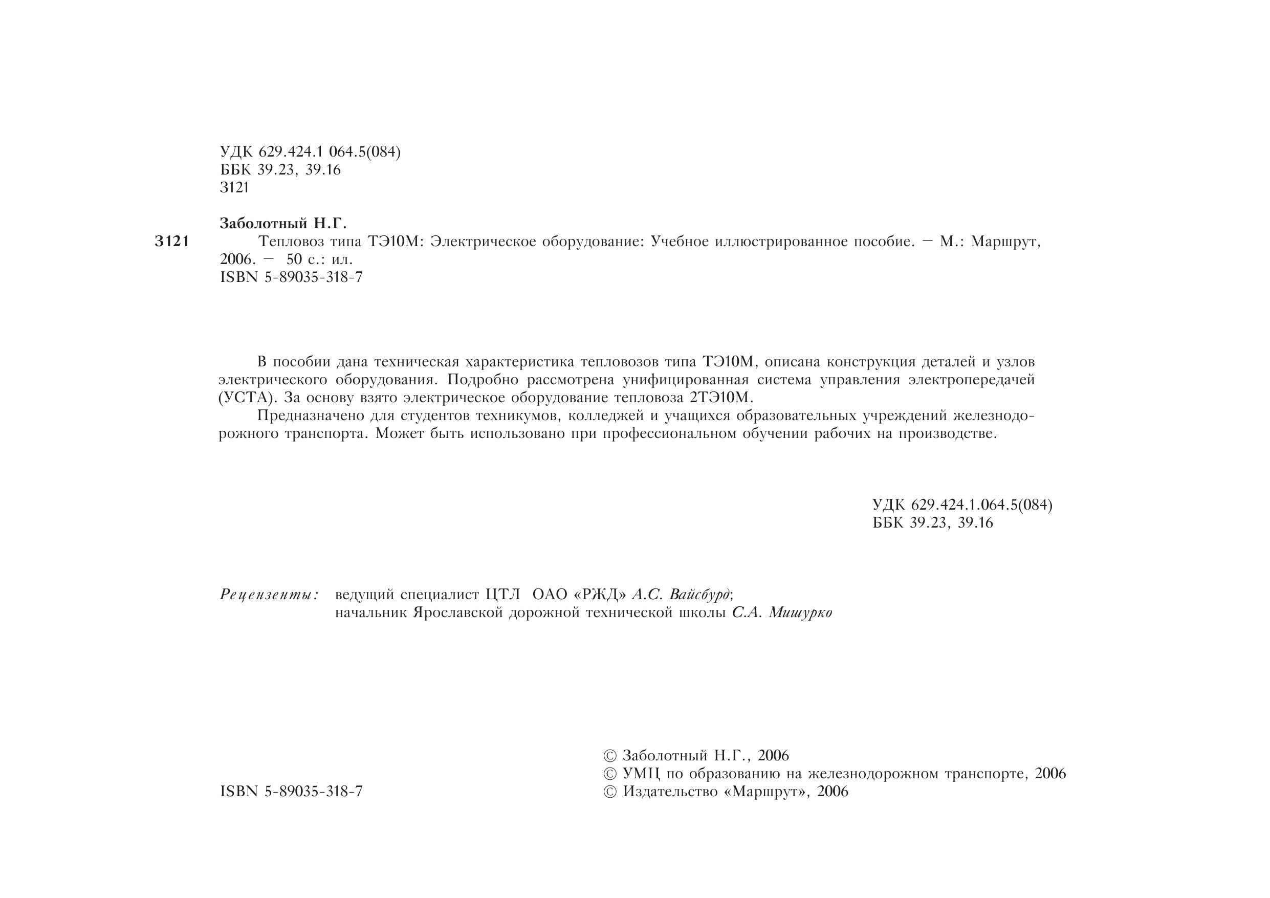 В пособии дана техническая характеристика тепловозов типа ТЭ10М, описана конструкция деталей и узлов электрического оборудования. Подробно рассмотрена унифицированная система управления электропередачей (УСТА). 3а основу взято электрическое оборудование тепловоза 2ТЭ10М. Предназначено для студентов техникумов, колледжей и учащихся образовательных учреждений железнодорожного транспорта. Может быть использовано при профессиональном обучении рабочих на производстве.