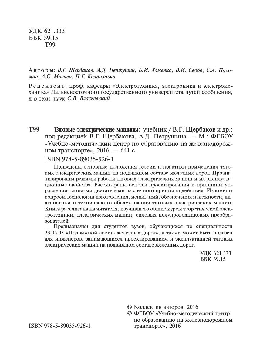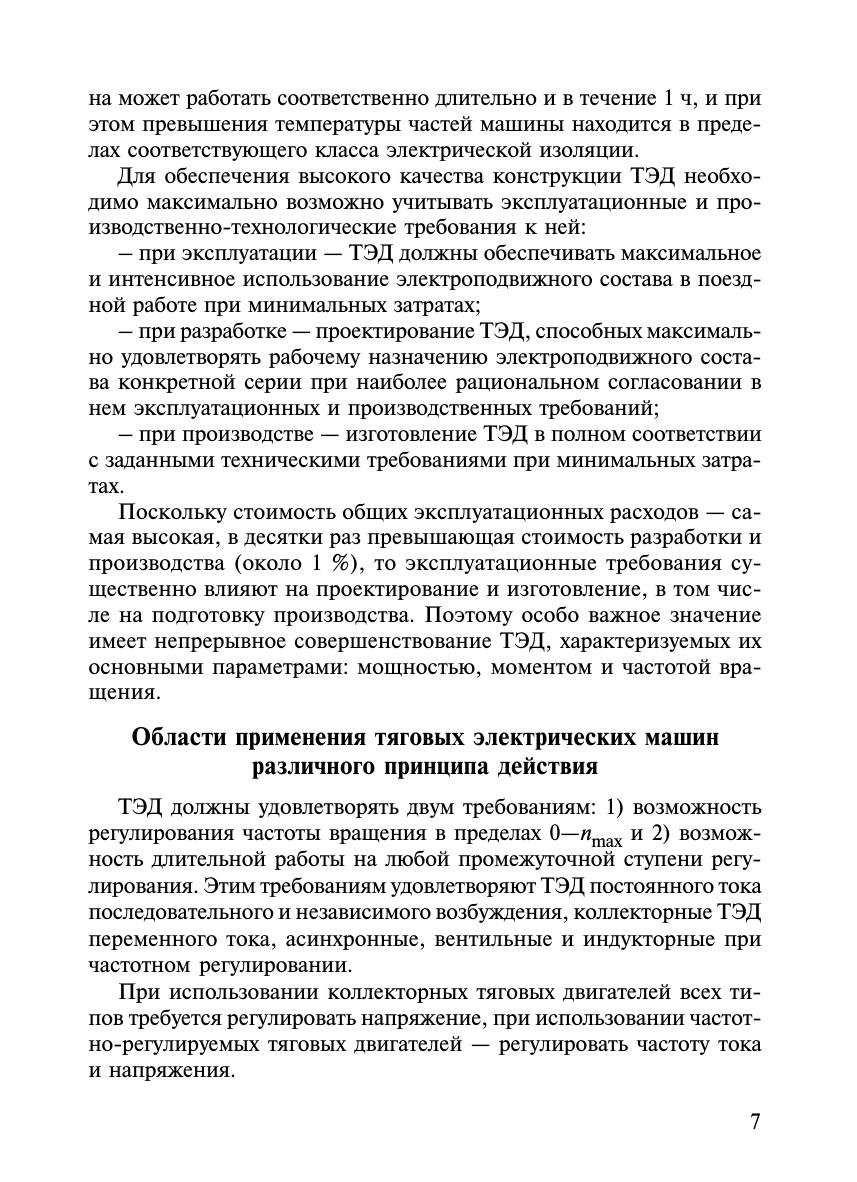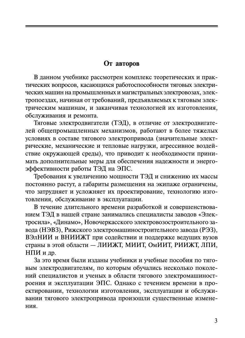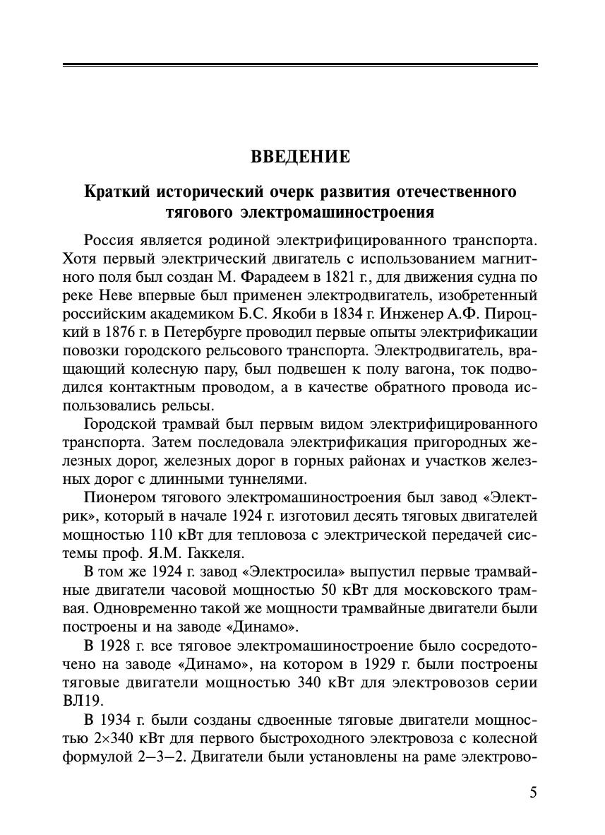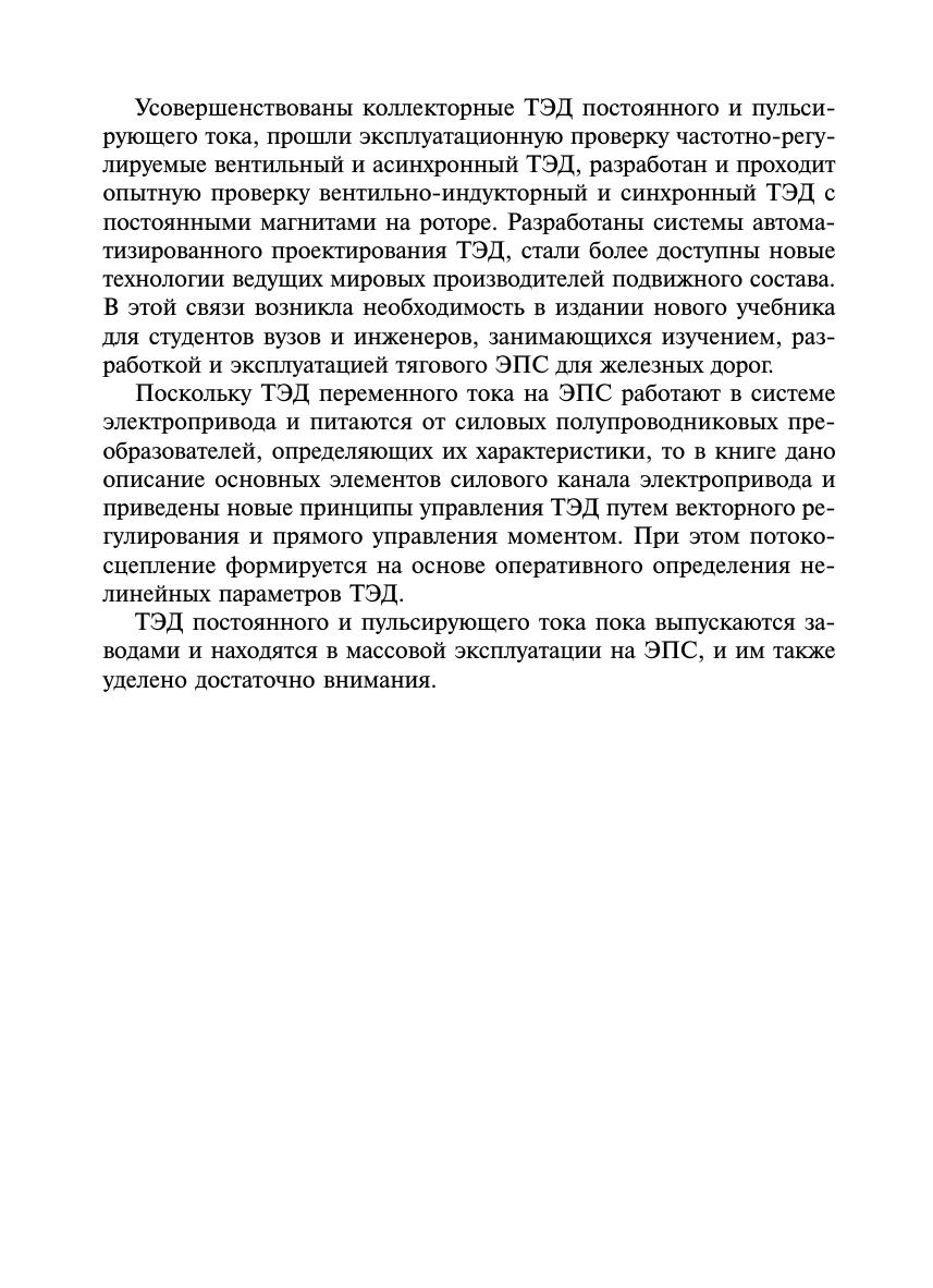 Приведены основные положения теории и практики применения тяговых электрических машин на подвижном составе железных дорог. Проанализированы режимы работы тяговых электрических машин и их эксплуатационные свойства. Рассмотрены основы проектирования и принципы управления тяговыми двигателями различного принципа действия. Изложены вопросы технологии изготовления, испытаний, обеспечения надежности, диагностики и технического обслуживания тяговых электрических машин. Книга рассчитана на читателя, изучившего общие курсы теоретической электротехники, электрических машин, силовых полупроводниковых преобразователей.