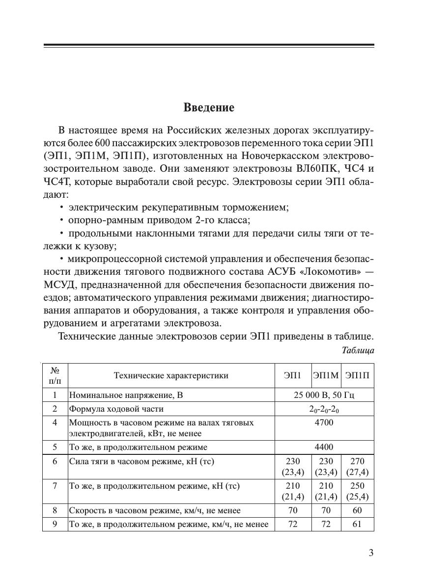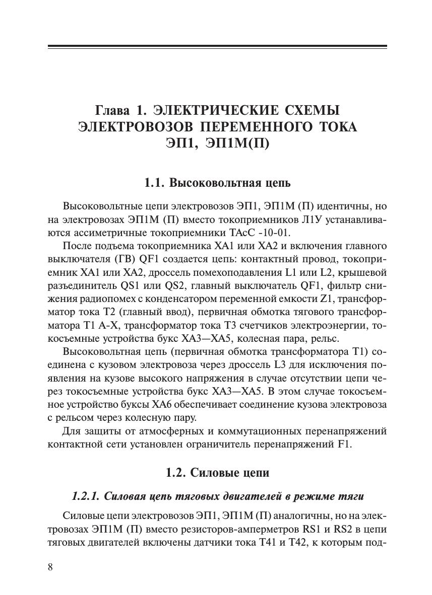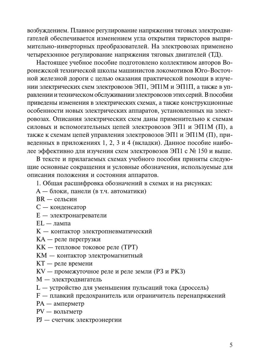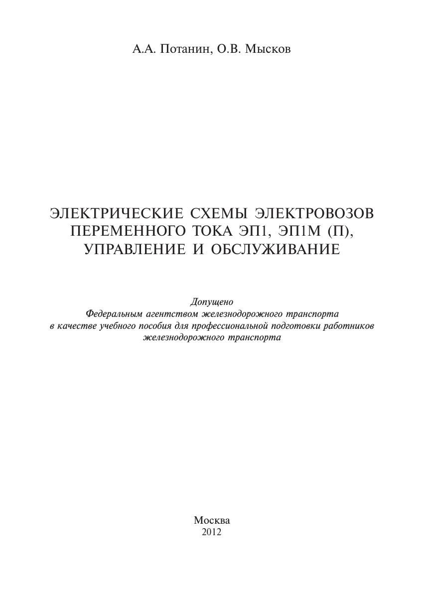 Приведены электрические схемы силовых и управляющих цепей электровозов переменного тока серии ЭП1 (ЭП1, ЭП1М, ЭП1П). Подробно изложена работа схем в различных режимах, расположение оборудования в кузове электровозов, состав аппаратуры в различных блоках и ее технические характеристики. Особое внимание уделено вопросам приемки электровозов и управления ими, а также способам обнаружения и устранениия неисправностей в электрических схемах в пути следования. Предназначено для профессиональной подготовки работников локомотивных бригад и депо, пунктов технического обслуживания электровозов переменного тока. Может быть полезно для изучения в технических школах, техникумах и колледжах.