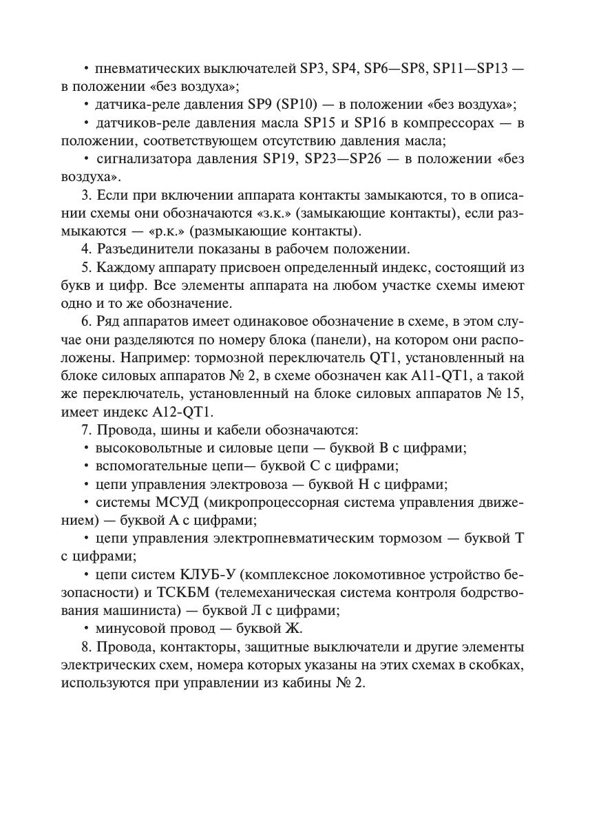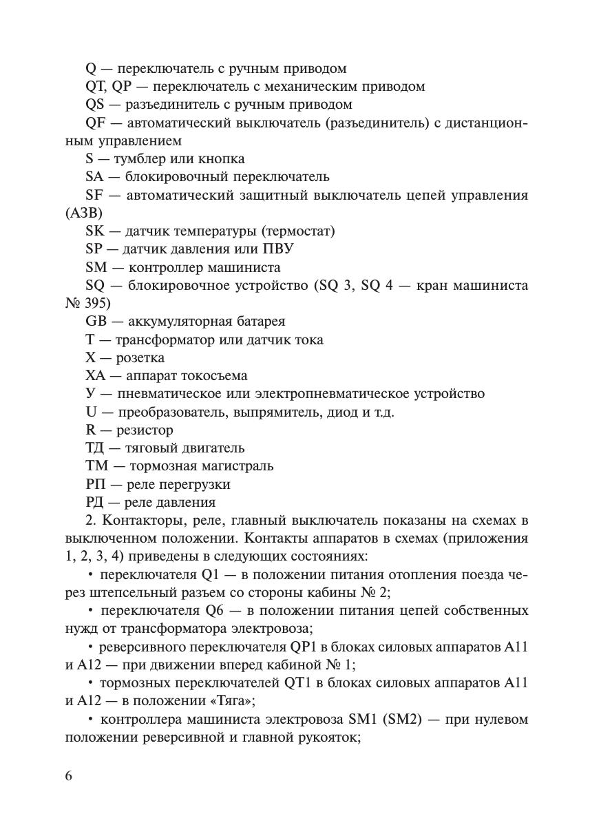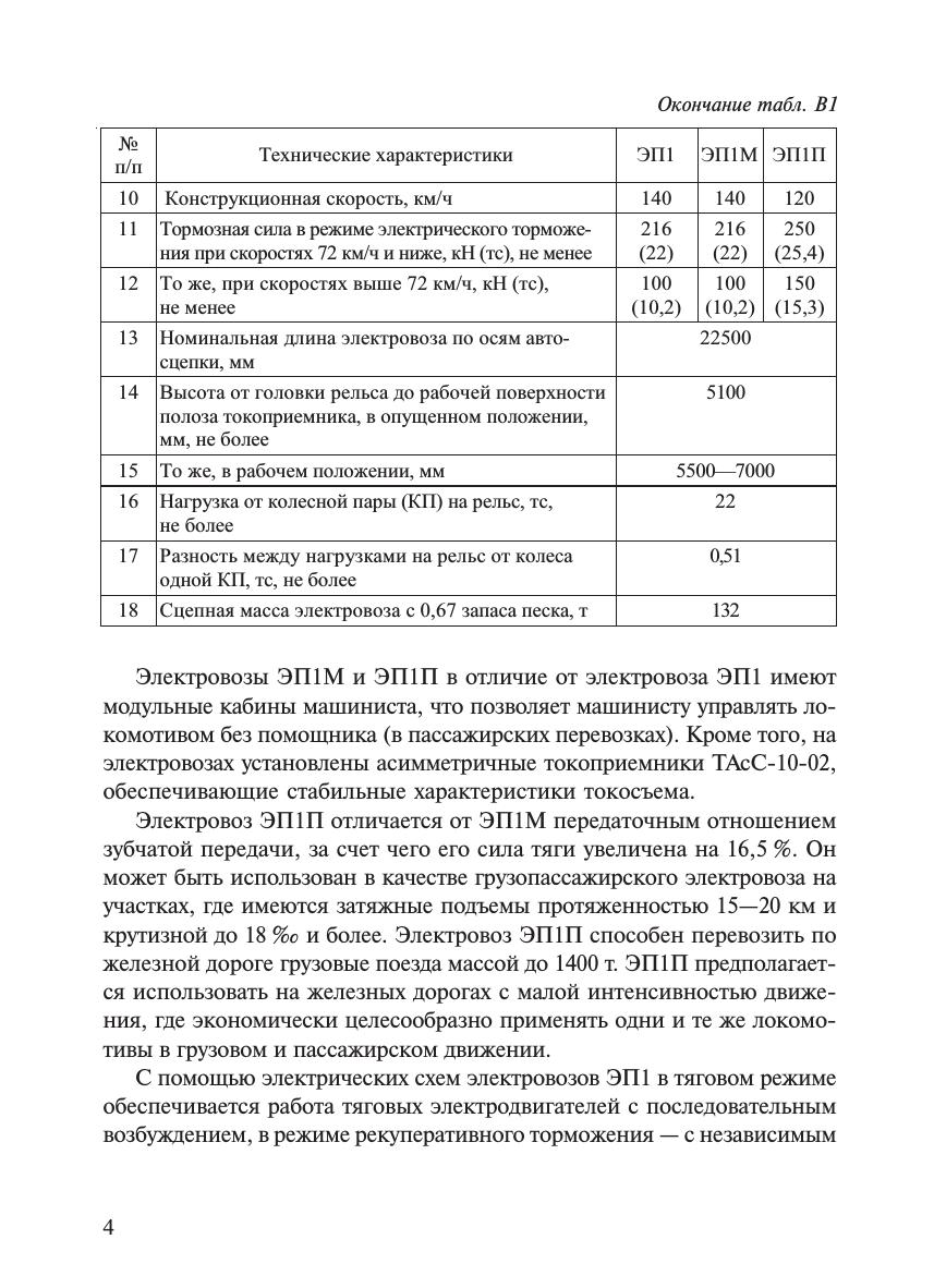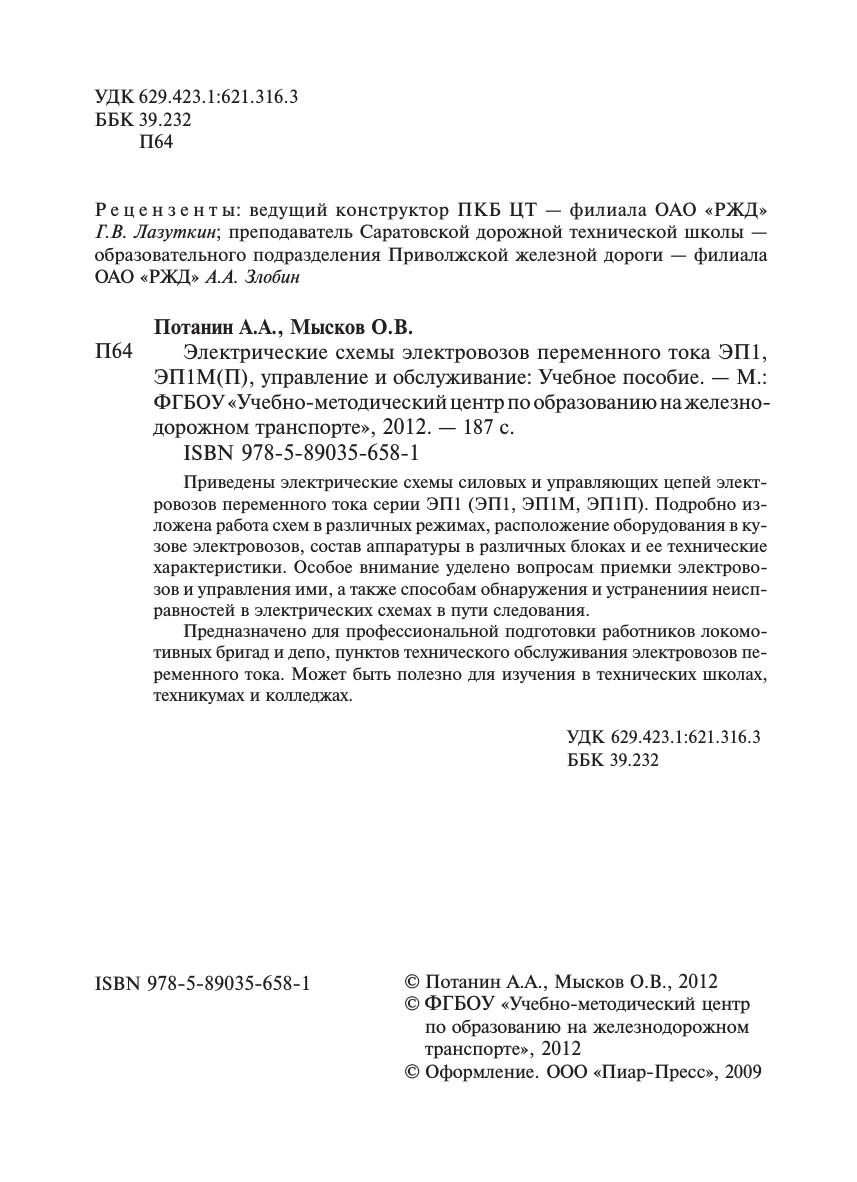 Приведены электрические схемы силовых и управляющих цепей электровозов переменного тока серии ЭП1 (ЭП1, ЭП1М, ЭП1П). Подробно изложена работа схем в различных режимах, расположение оборудования в кузове электровозов, состав аппаратуры в различных блоках и ее технические характеристики. Особое внимание уделено вопросам приемки электровозов и управления ими, а также способам обнаружения и устранениия неисправностей в электрических схемах в пути следования. Предназначено для профессиональной подготовки работников локомотивных бригад и депо, пунктов технического обслуживания электровозов переменного тока. Может быть полезно для изучения в технических школах, техникумах и колледжах.