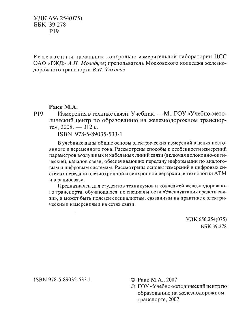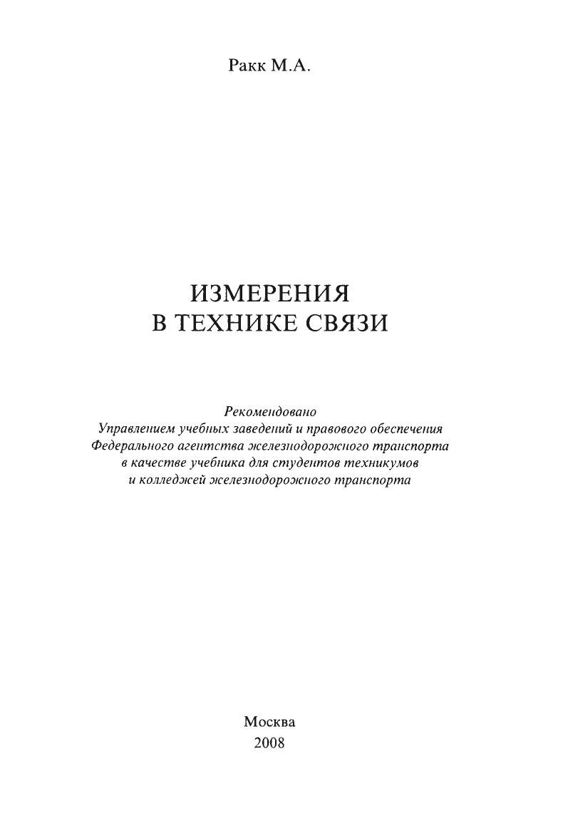 В учебнике даны общие основы электрических измерений в цепях постоянного и переменного тока. Рассмотрены способы и особенности измерений параметров воздушных и кабельных линий связи (включая волоконно-оптические), каналов связи, обеспечивающих передачу информации по аналоговым и цифровым системам. Рассмотрены основы измерений в цифровых системах передачи плезиохронной и синхронной иерархии, в технологии АТМ и в радиосвязи. Предназначен для студентов техникумов и колледжей железнодорожного транспорта, обучающихся по специальности «Эксплуатация средств связи», и может быть полезен специалистам, связанным на практике с электрическими измерениями.