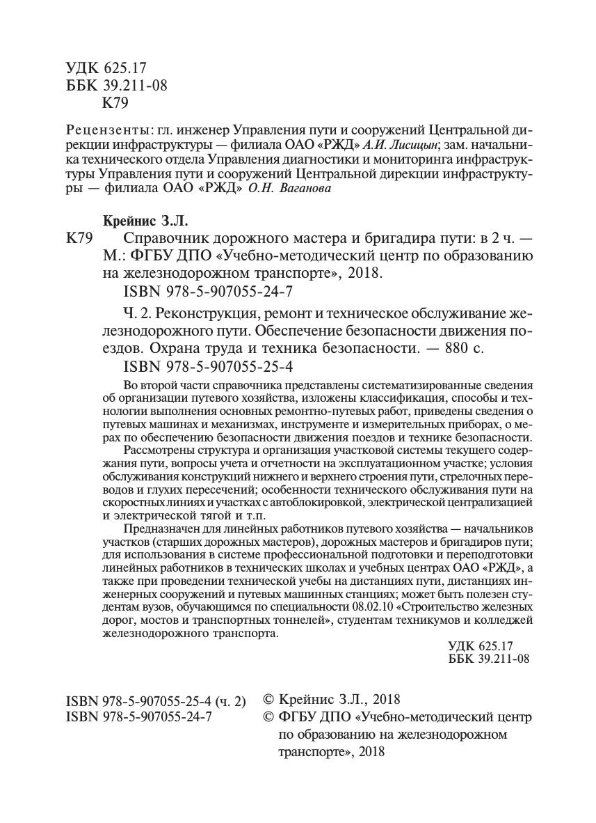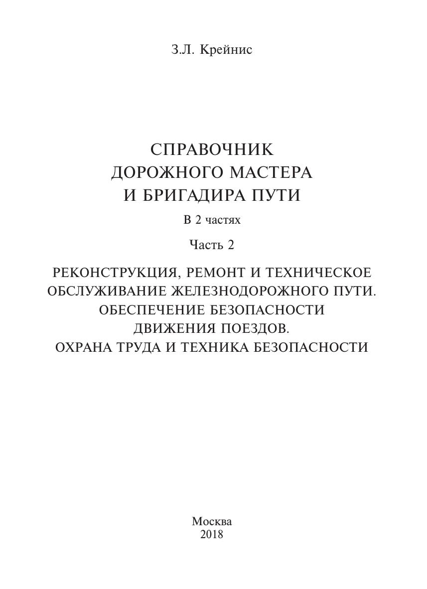Крейнис, З.Л. Справочник дорожного мастера и бригадира пути. В 2 частях. Часть 2. Реконструкция, ремонт и техническое обслуживание железнодорожного пути. Обеспечение безопасности движения поездов. Охрана труда и техника безопасности. : справочник / З. Л. Крейнис. — Москва : ФГБУ ДПО «Учебно-методический центр по образованию на железнодорожном транспорте», 2018. — 880 с. — 978-5-907055-24-7 978-5-907055-25-4. — Текст : электронный // УМЦ ЖДТ : электронная библиотека. — URL: https://umczdt.ru/books/1202/227472/ (дата обращения 14.02.2026). — Режим доступа: по подписке.