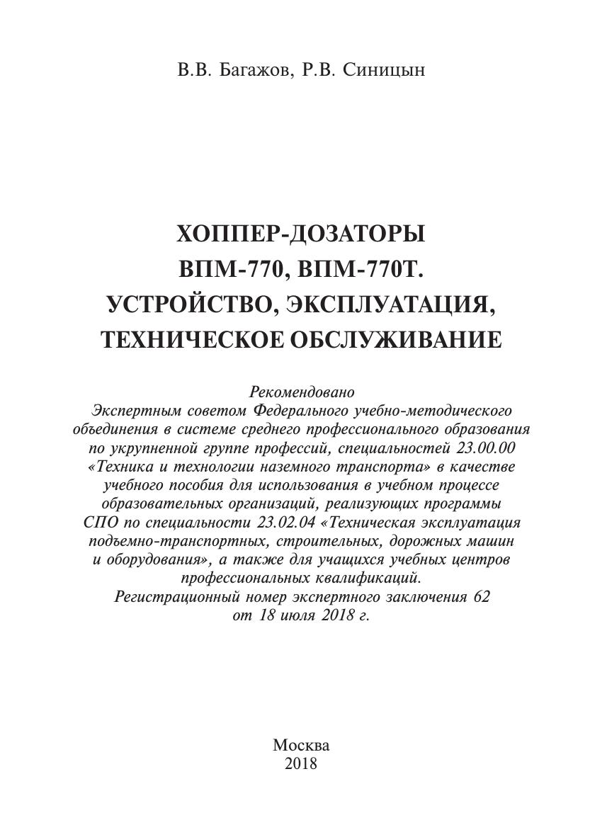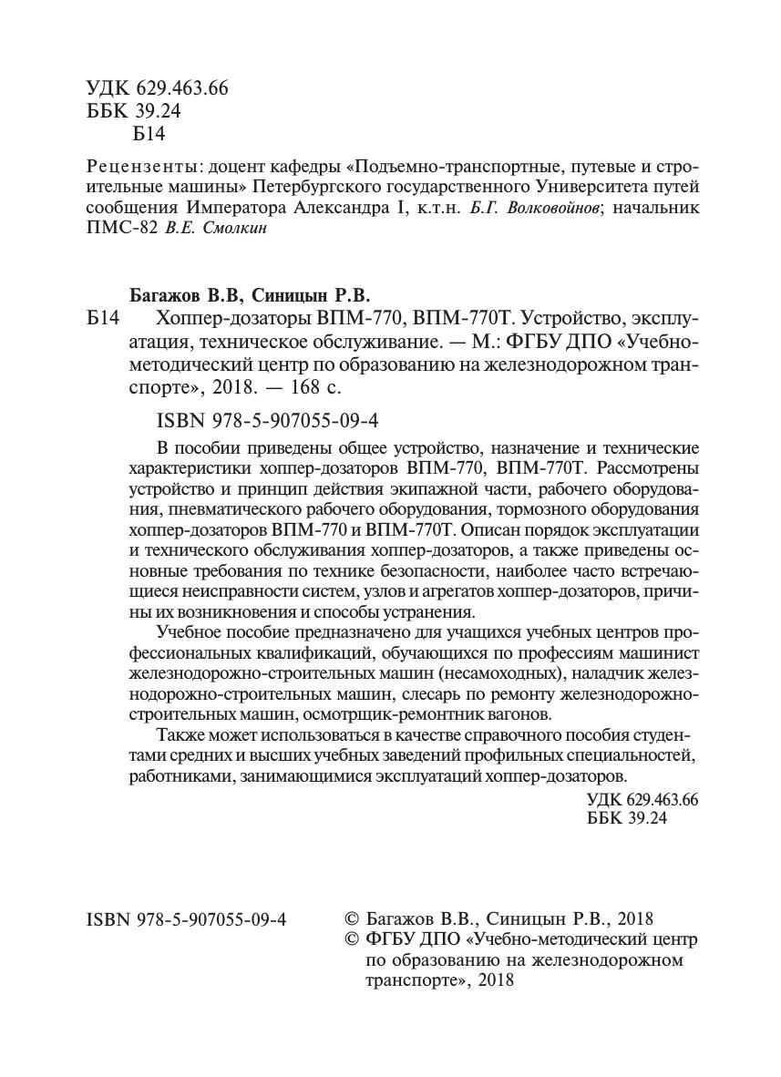 Багажов, В.В. Хоппер-дозаторы ВПМ-770, ВПМ-770Т. Устройство, эксплуатация, техническое обслуживание : учебное пособие / В. В. Багажов, Р. В. Синицын. — Москва : ФГБУ ДПО «Учебно-методический центр по образованию на железнодорожном транспорте», 2018. — 168 с. — 978-5-907055-09-4. — Текст : электронный // УМЦ ЖДТ : электронная библиотека. — URL: https://umczdt.ru/books/1202/227905/ (дата обращения 30.04.2026). — Режим доступа: по подписке.