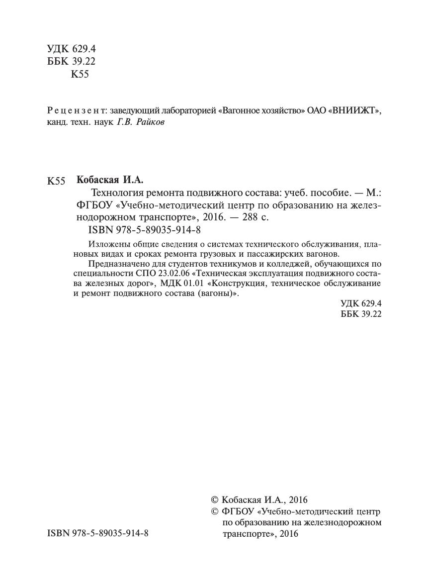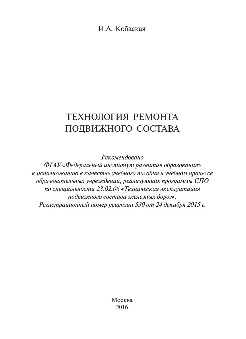 Кобаская, И.А. Технология ремонта подвижного состава : учебное пособие / И. А. Кобаская. — Москва : ФГБОУ «Учебно-методический центр по образованию на железнодорожном транспорте», 2016. — 288 с. — 978-5-89035-914-8. — Текст : электронный // УМЦ ЖДТ : электронная библиотека. — URL: https://umczdt.ru/books/1206/155711/ (дата обращения 22.04.2026). — Режим доступа: по подписке.