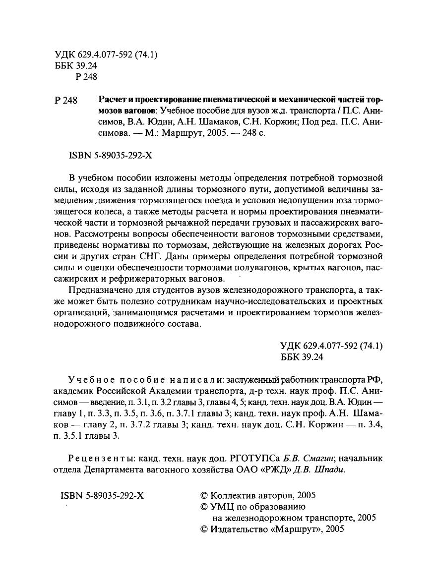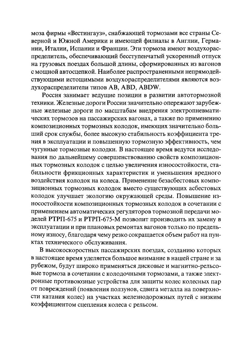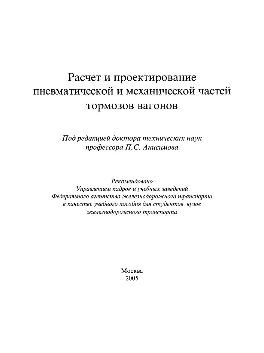 В учебном пособии изложены методы определения потребной тормозной силы, исходя из заданной длины тормозного пути, допустимой величины замедления движения тормозящегося поезда и условия недопущения юза тормозящегося колеса, а также методы расчета и нормы проектирования пневматической части и тормозной рычажной передачи грузовых и пассажирских вагонов. Рассмотрены вопросы обеспеченности вагонов тормозными средствами, приведены нормативы по тормозам, действующие на железных дорогах России и других стран СНГ. Даны примеры определения потребной тормозной силы и оценки обеспеченности тормозами полувагонов, крытых вагонов, пассажирских и рефрижераторных вагонов. Предназначено для студентов вузов железнодорожного транспорта, а также может быть полезно сотрудникам научно-исследовательских и проектных организаций, занимающимся расчетами и проектированием тормозов железнодорожного подвижного состава.