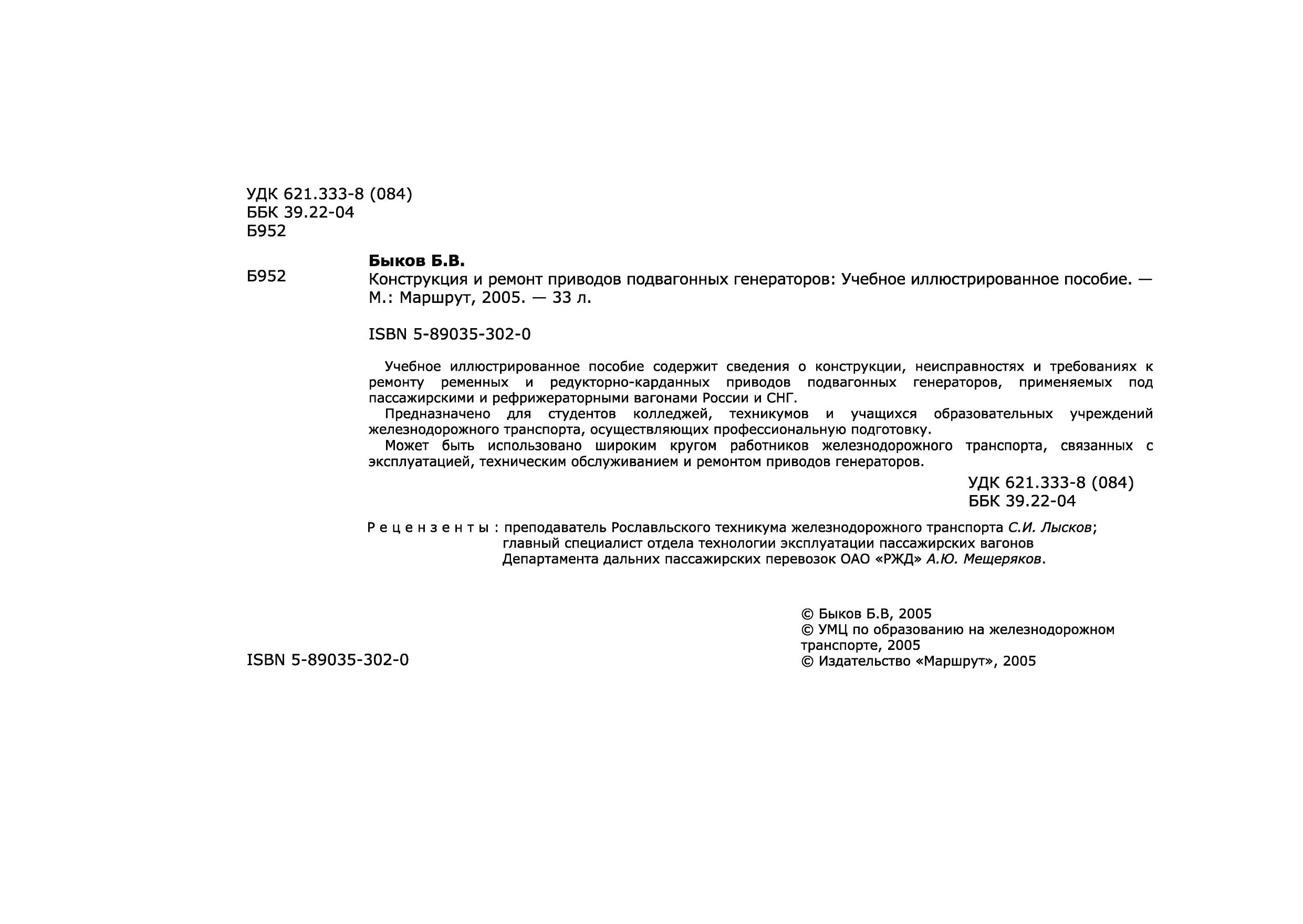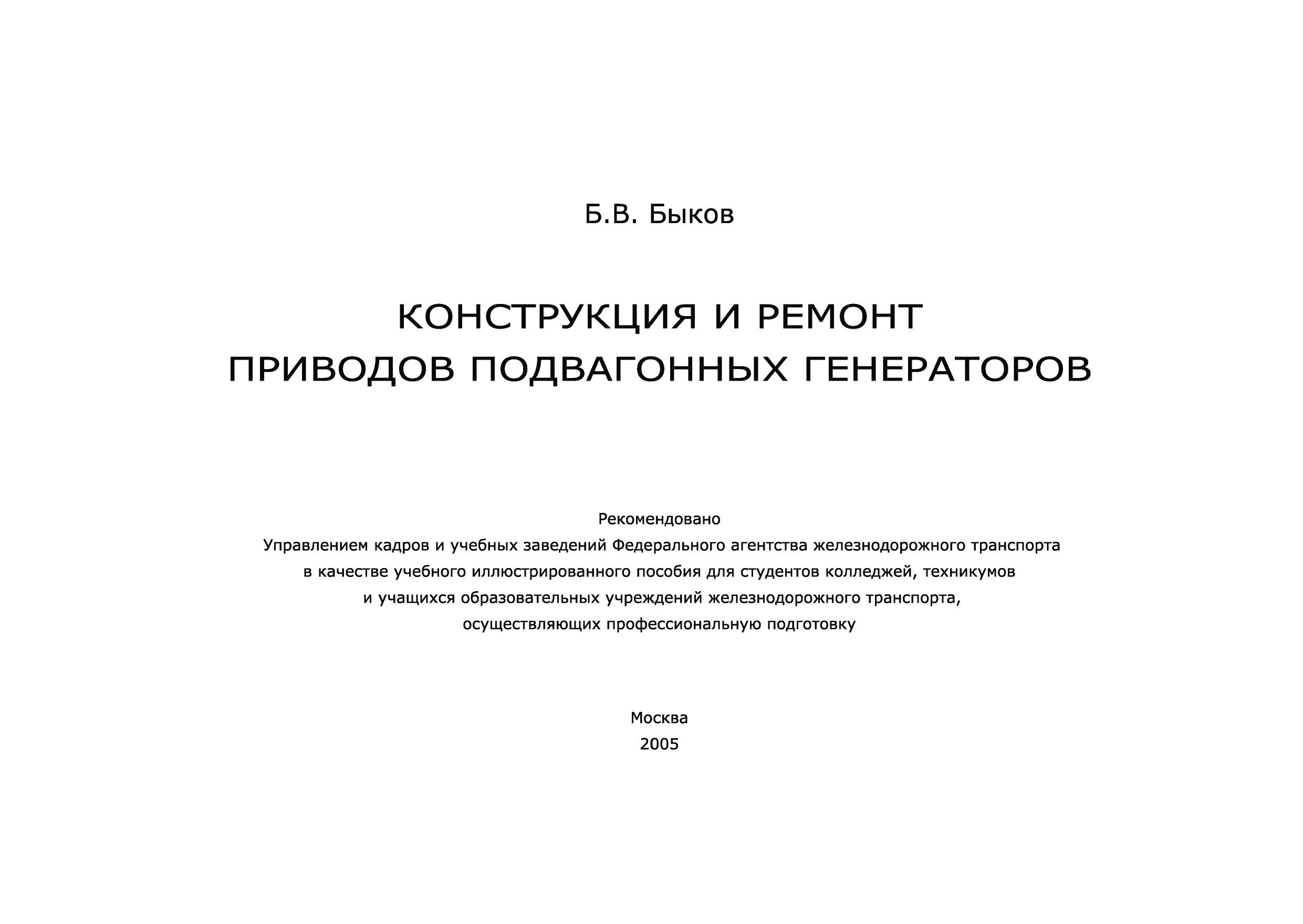 Учебное иллюстрированное пособие содержит сведения о конструкции, неисправностях и требованиях к ремонту ременных и редукторно-карданных приводов подвагонных генераторов, применяемых под пассажирскими и рефрижераторными вагонами России и СНГ. Предназначено для студентов колледжей, техникумов и учащихся образовательных учреждений железнодорожного транспорта, осуществляющих профессиональную подготовку. Может быть использовано широким кругом работников железнодорожного транспорта, связанных с эксплуатацией, техническим обслуживанием и ремонтом приводов генераторов.