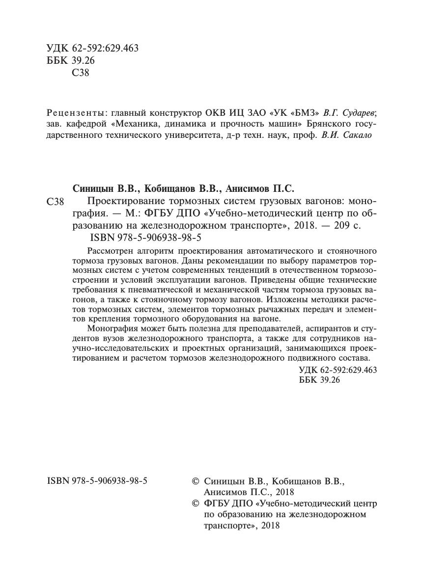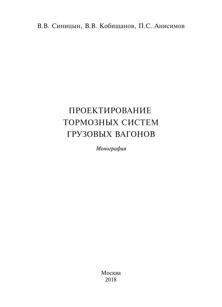 Синицын, В.В. Проектирование тормозных систем грузовых вагонов : монография / В. В. Синицын, В. В. Кобищанов, П. С. Анисимов. — Москва : ФГБУ ДПО «Учебно-методический центр по образованию на железнодорожном транспорте», 2018. — 209 с. — 978-5-906938-98-5. — Текст : электронный // УМЦ ЖДТ : электронная библиотека. — URL: https://umczdt.ru/books/1206/223415/ (дата обращения 22.04.2026). — Режим доступа: по подписке.