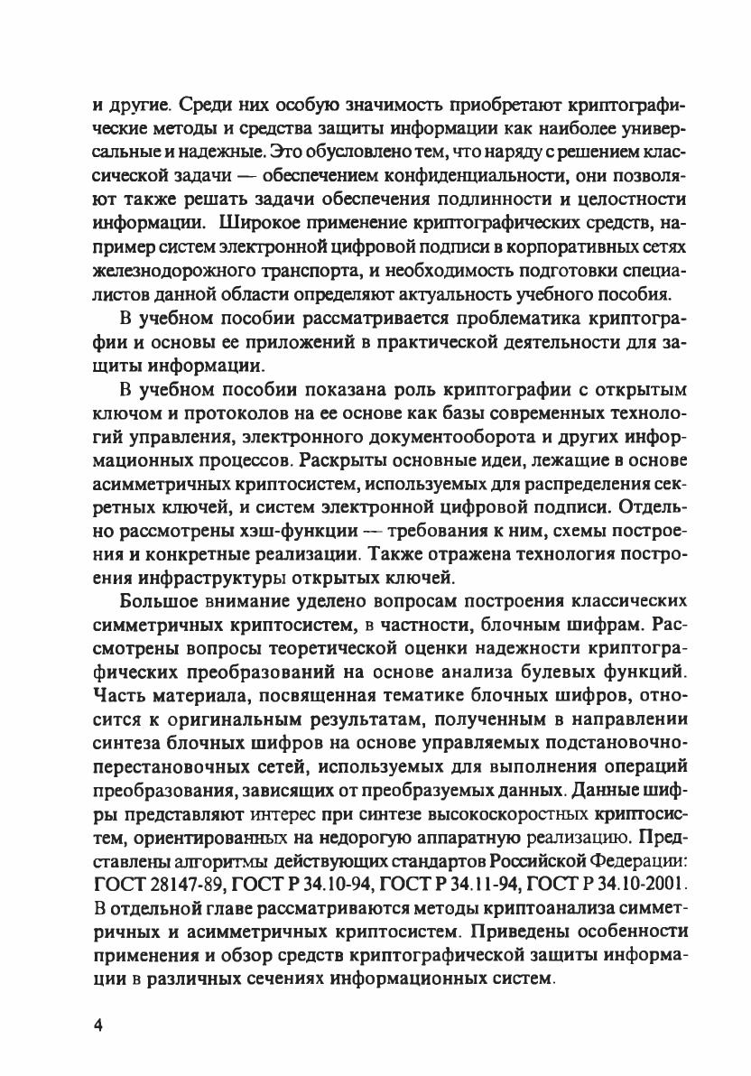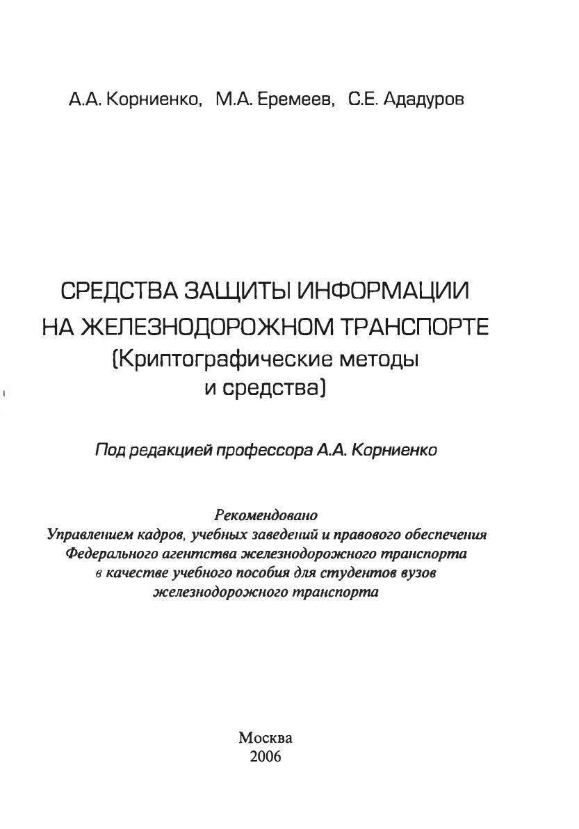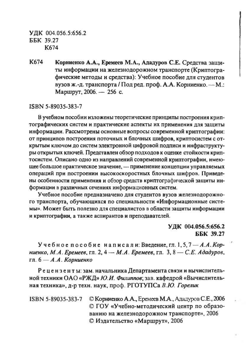 Учебное пособие предназначено для студентов вузов железнодорожного транспорта, обучающихся по специальности «Информационные системы». Может быть полезно для специалистов в области защиты информации и криптографии, а также аспирантов и преподавателей.
