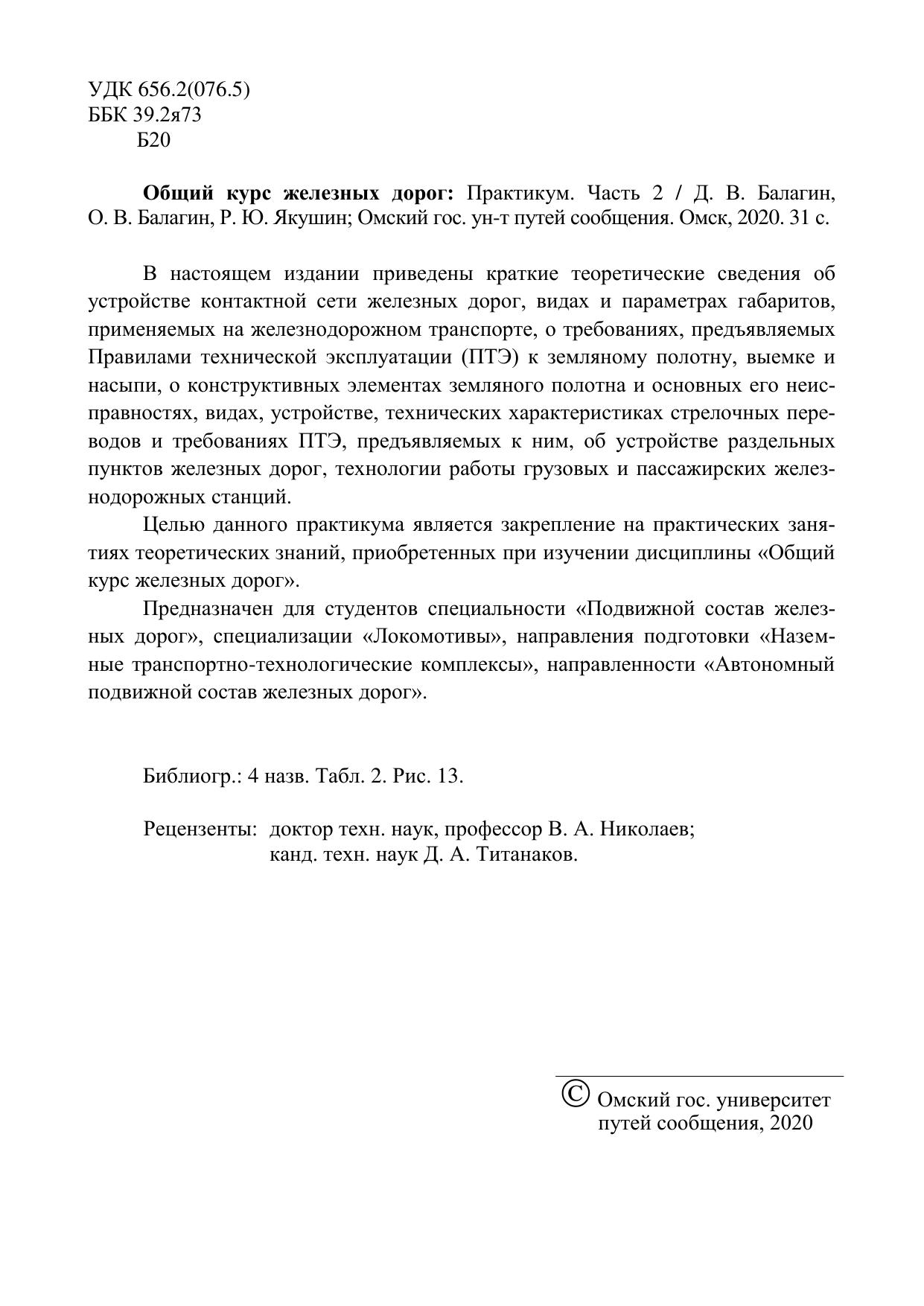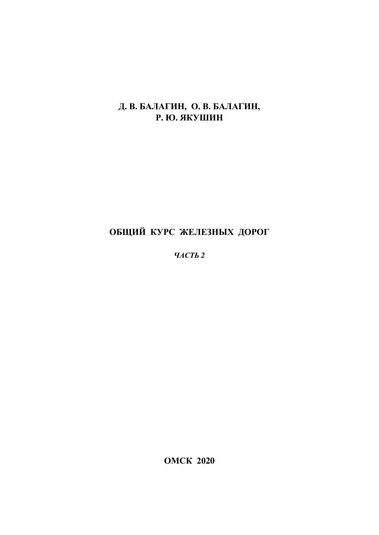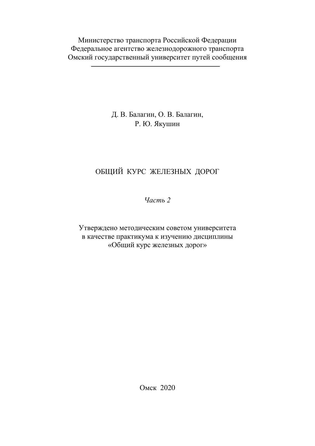Балагин, Д.В. Общий курс железных дорог. Часть 2 : учебник / Д. В. Балагин, О. В. Балагин, Р. Ю. Якушин. — Омск : ОмГУПС, 2020. — 31 с. — Текст : электронный // УМЦ ЖДТ : электронная библиотека. — URL: https://umczdt.ru/books/1212/252965/ (дата обращения 30.04.2026). — Режим доступа: по подписке.