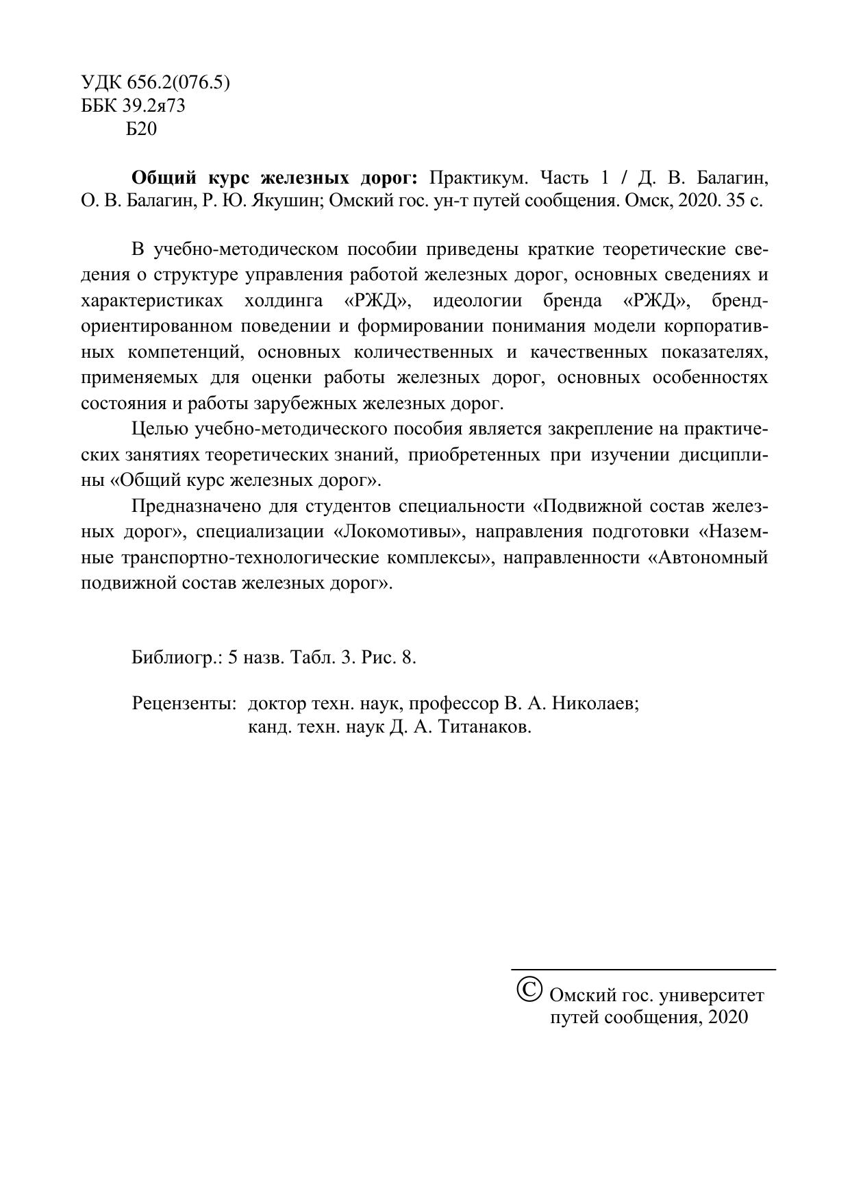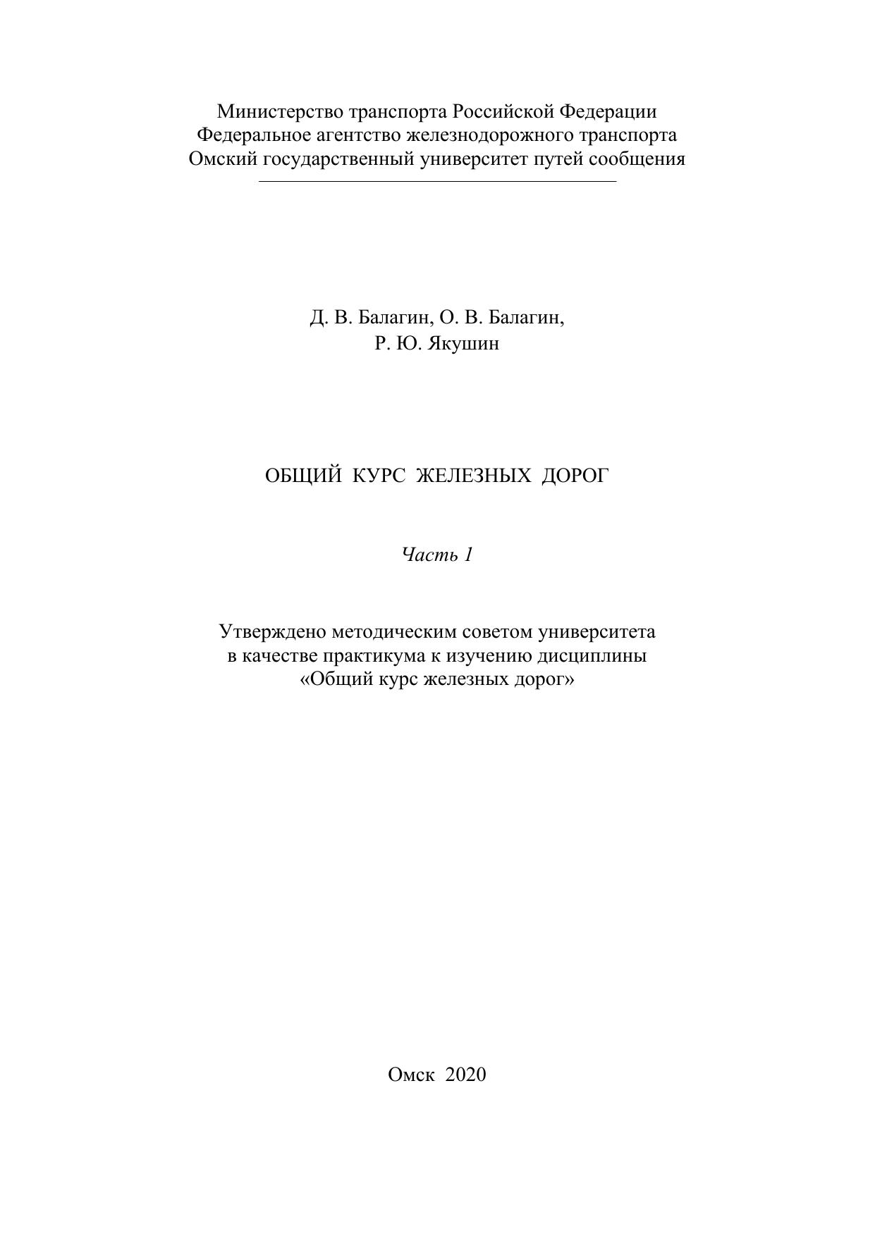 Балагин, Д.В. Общий курс железных дорог. Часть 1 : учебник / Д. В. Балагин, О. В. Балагин, Р. Ю. Якушин. — Омск : ОмГУПС, 2020. — 35 с. — Текст : электронный // УМЦ ЖДТ : электронная библиотека. — URL: https://umczdt.ru/books/1212/252966/ (дата обращения 30.04.2026). — Режим доступа: по подписке.