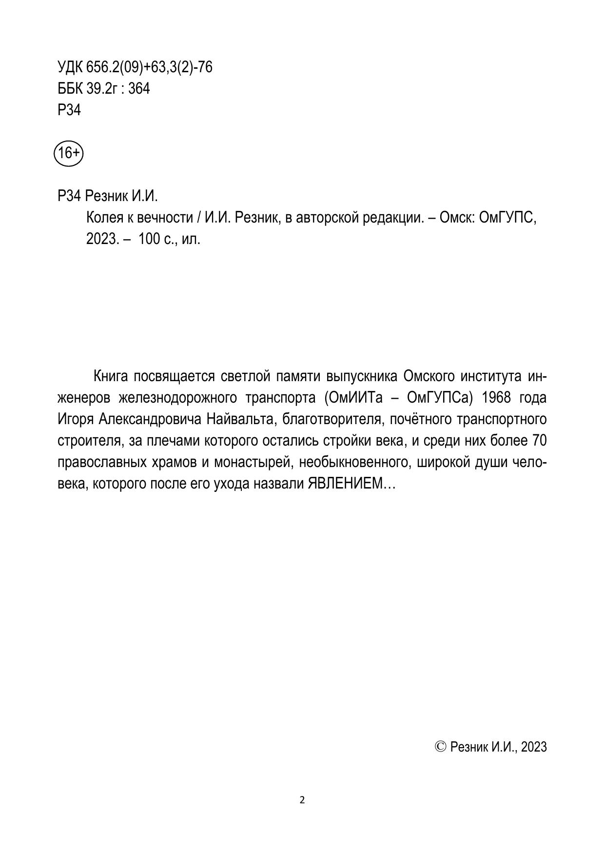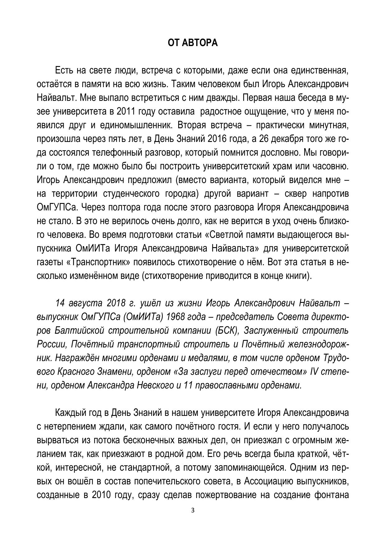 Книга посвящается светлой памяти выпускника Омского института инженеров железнодорожного транспорта (ОмИИТа – ОмГУПСа) 1968 года Игоря Александровича Найвальта, благотворителя, почётного транспортного строителя, за плечами которого остались стройки века, и среди них более 70 православных храмов и монастырей, необыкновенного, широкой души человека, которого после его ухода назвали ЯВЛЕНИЕМ…