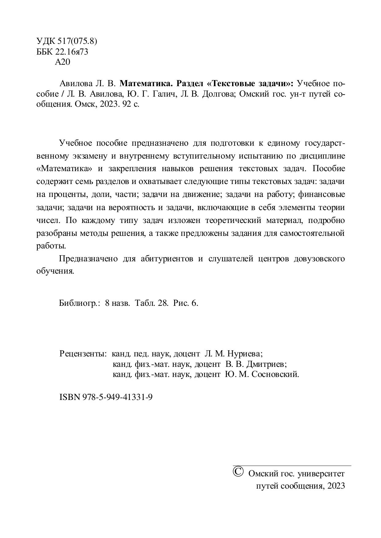 Авилова, Л.В. Математика. Раздел «Текстовые задачи» : учебник / Л. В. Авилова, Ю. Г. Галич, Л. В. Долгова. — Омск : ОмГУПС, 2023. — 92 с. — 978-5-949-41331-9. — Текст : электронный // УМЦ ЖДТ : электронная библиотека. — URL: https://umczdt.ru/books/1212/297568/ (дата обращения 22.01.2026). — Режим доступа: по подписке.