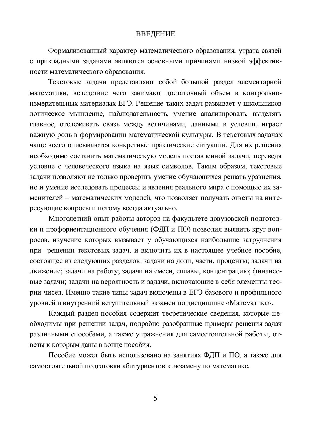 Учебное пособие предназначено для подготовки к единому государственному экзамену и внутреннему вступительному испытанию по дисциплине «Математика» и закрепления навыков решения текстовых задач. Пособие содержит семь разделов и охватывает следующие типы текстовых задач: задачи на проценты, доли, части; задачи на движение; задачи на работу; финансовые задачи; задачи на вероятность и задачи, включающие в себя элементы теории чисел. По каждому типу задач изложен теоретический материал, подробно разобраны методы решения, а также предложены задания для самостоятельной работы.