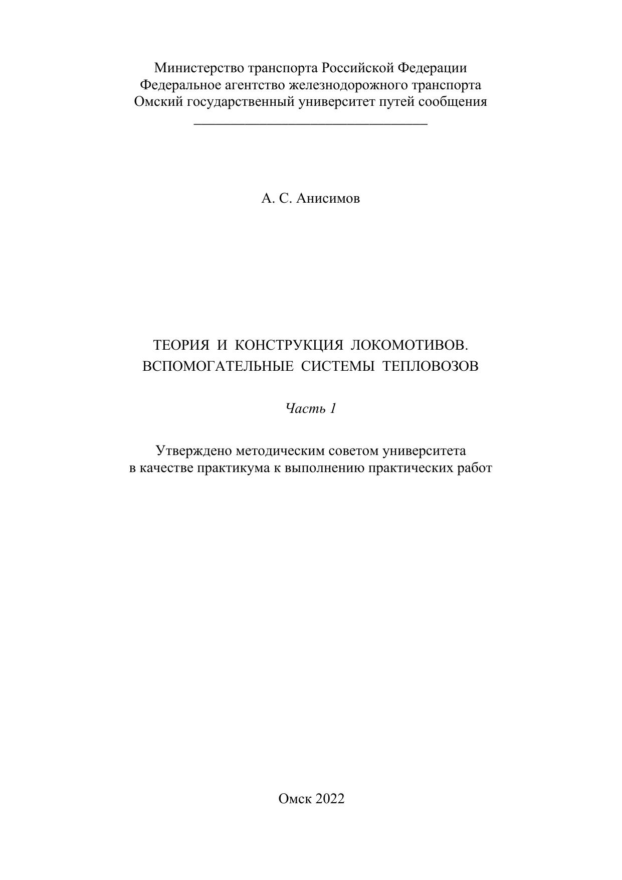Анисимов, А.С. Теория и конструкция локомотивов. Вспомогательные системы тепловозов: практикум к выполнению практических работ. Часть 1 : / А. С. Анисимов. — Омск : ОмГУПС, 2022. — 31 с. — Текст : электронный // УМЦ ЖДТ : электронная библиотека. — URL: https://umczdt.ru/books/1212/297604/ (дата обращения 13.01.2026). — Режим доступа: по подписке.
