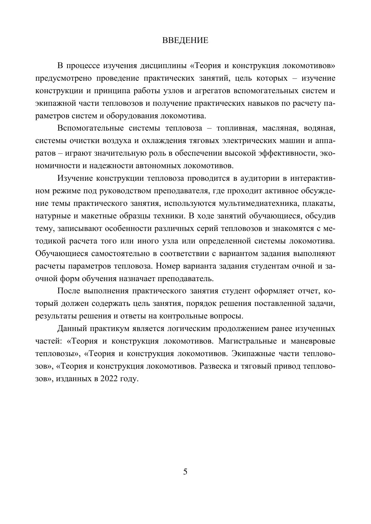 В практикуме рассмотрены конструктивные особенности узлов и систем тепловозов, предложен ряд задач для расчета основных параметров локомотива, конструкции узлов и систем. Целью практикума является закрепление знаний, полученных в процессе изучения теоретического курса, приобретение навыков по расчету параметров систем тепловоза.