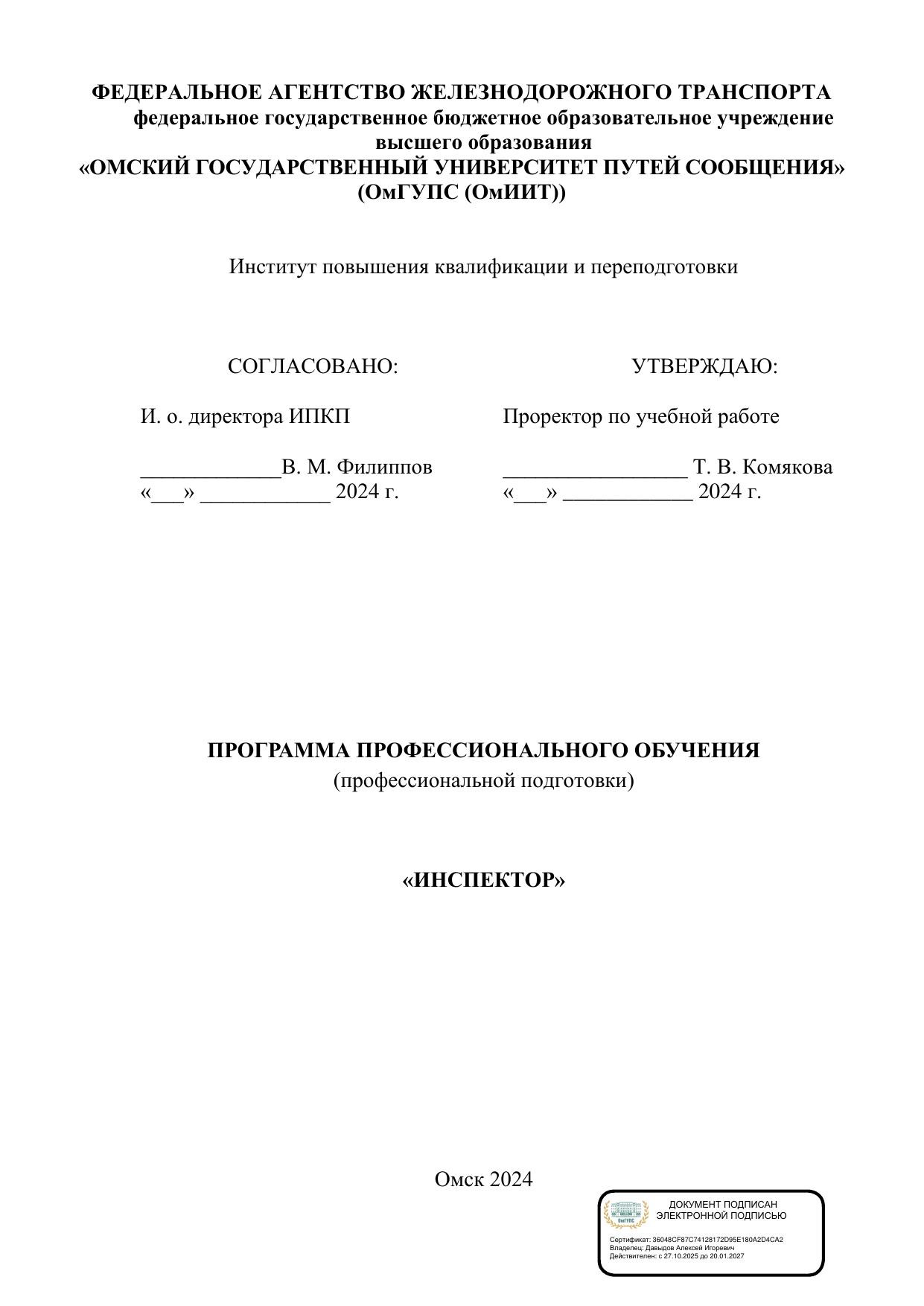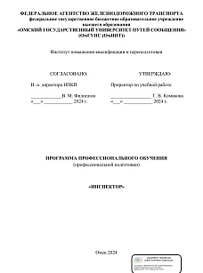 Инспектор : программа профессиональной подготовки / . — Омск : ОмГУПС, 2024. — 16 с. — Текст : электронный // УМЦ ЖДТ : электронная библиотека. — URL: https://umczdt.ru/books/1212/299744/ (дата обращения 22.04.2026). — Режим доступа: по подписке.