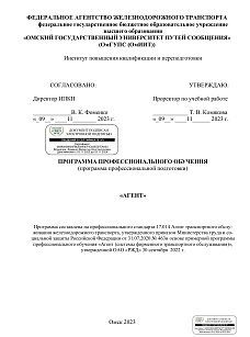 Агент : программа профессиональной подготовки / . — Омск : ОмГУПС, 2023. — 40 с. — Текст : электронный // УМЦ ЖДТ : электронная библиотека. — URL: https://umczdt.ru/books/1212/299748/ (дата обращения 22.04.2026). — Режим доступа: по подписке.