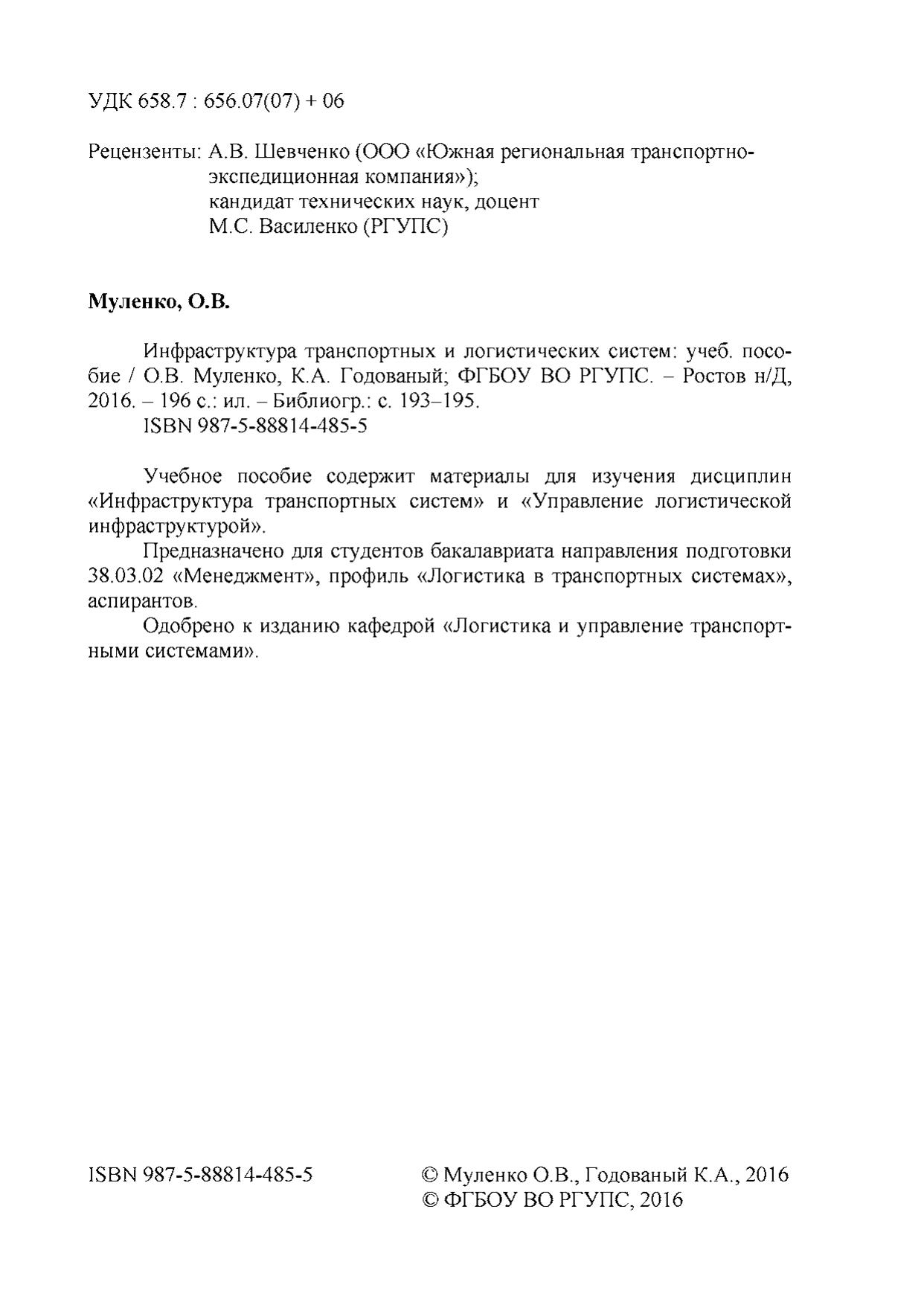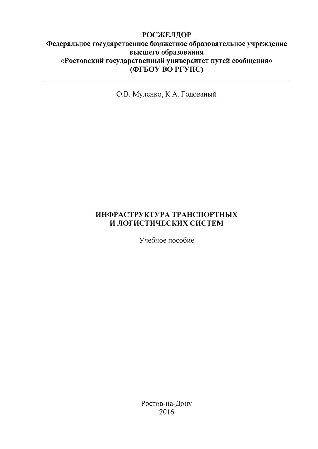 Муленко, О. В. Инфраструктура транспортных и логистических систем : / О. В. Муленко, К. А. Годованый. — Ростов-на-Дону : РГУПС, 2016. — 196 с. — 987-5-88814-485-5. — Текст : электронный // УМЦ ЖДТ : электронная библиотека. — URL: https://umczdt.ru/books/1214/253849/ (дата обращения 19.04.2026). — Режим доступа: по подписке.