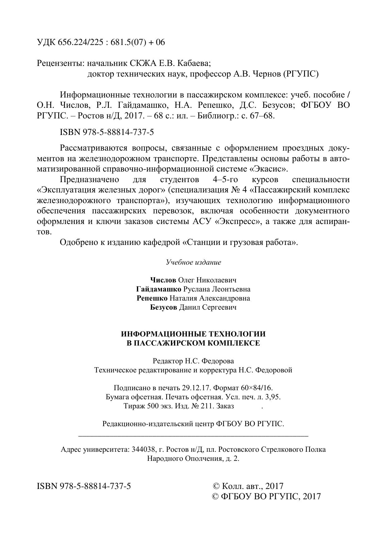 Числов, О.Н. Информационные технологии в пассажирском комплексе : / О. Н. Числов, Р. Л. Гайдамашко, Н. А. Репешко, Д. С. Безусов. — Ростов-на-Дону : РГУПС, 2017. — 68 с. — 978-5-88814-737-5. — Текст : электронный // УМЦ ЖДТ : электронная библиотека. — URL: https://umczdt.ru/books/1214/253858/ (дата обращения 30.04.2026). — Режим доступа: по подписке.