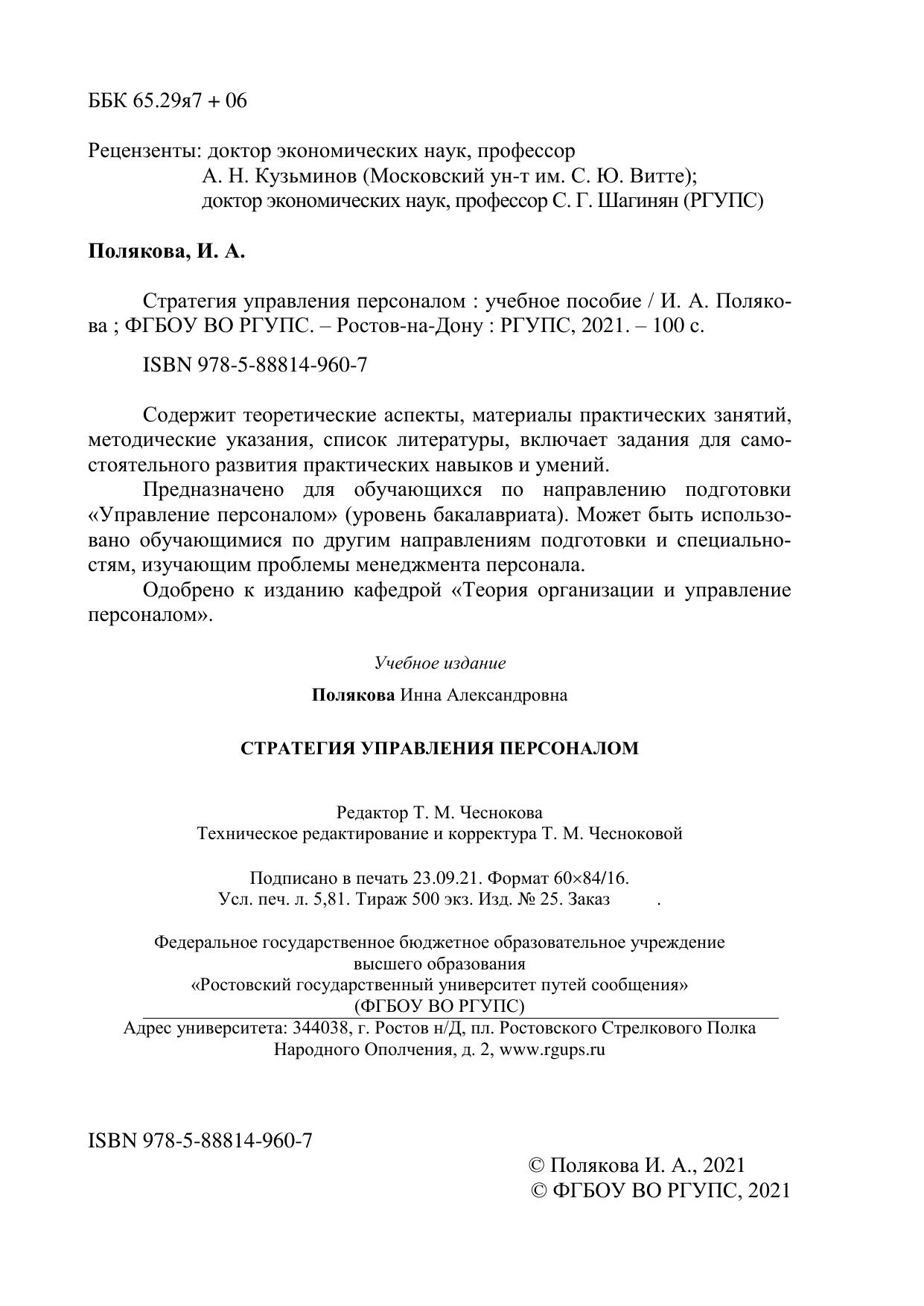 Полякова, И.А. Стратегия управления персоналом : учебное пособие / И. А. Полякова. — Ростов-на-Дону : РГУПС, 2021. — 100 с. — 978-5-88814-960-7. — Текст : электронный // УМЦ ЖДТ : электронная библиотека. — URL: https://umczdt.ru/books/1214/261954/ (дата обращения 19.04.2026). — Режим доступа: по подписке.