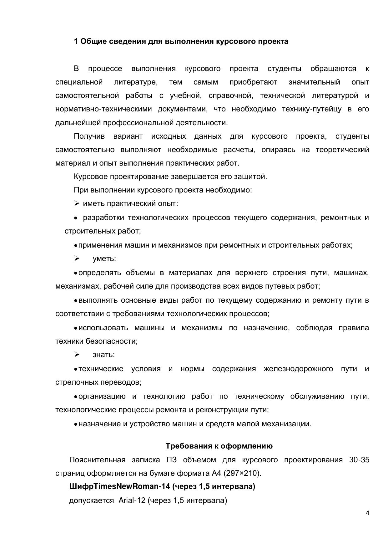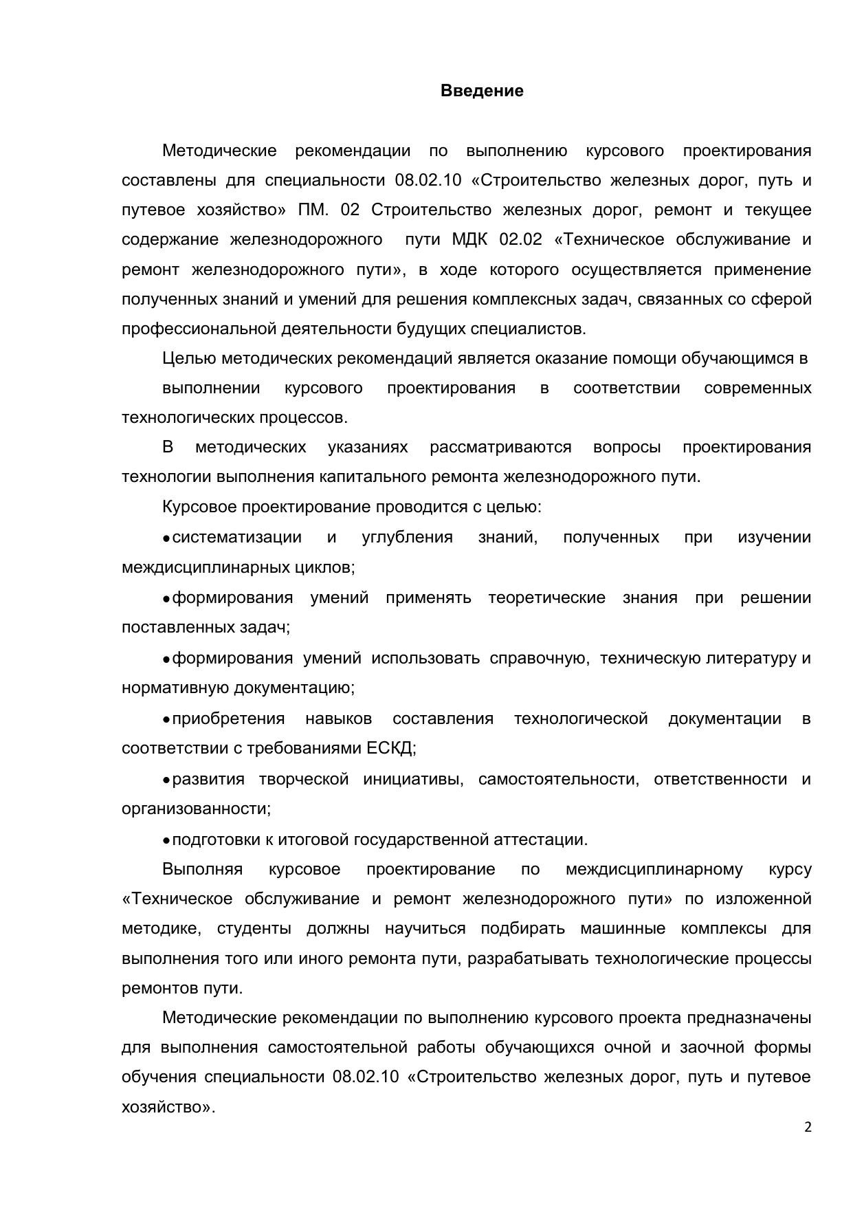 Методические рекомендации по выполнению курсового проектирования составлены для специальности 08.02.10 «Строительство железных дорог, путь и путевое хозяйство» ПМ. 02 Строительство железных дорог, ремонт и текущее содержание железнодорожного пути МДК 02.02 «Техническое обслуживание и ремонт железнодорожного пути», в ходе которого осуществляется применение полученных знаний и умений для решения комплексных задач, связанных со сферой профессиональной деятельности будущих специалистов.