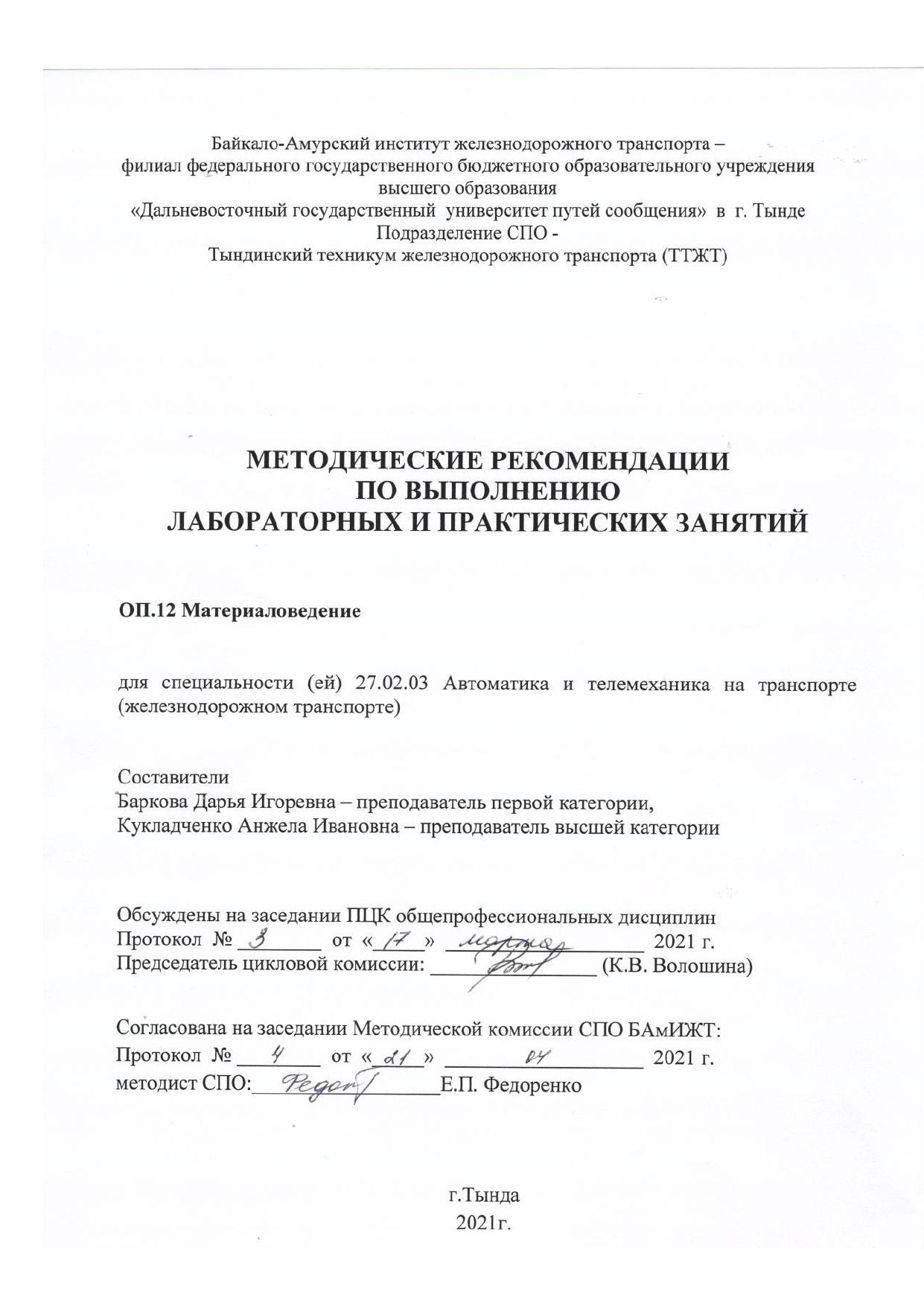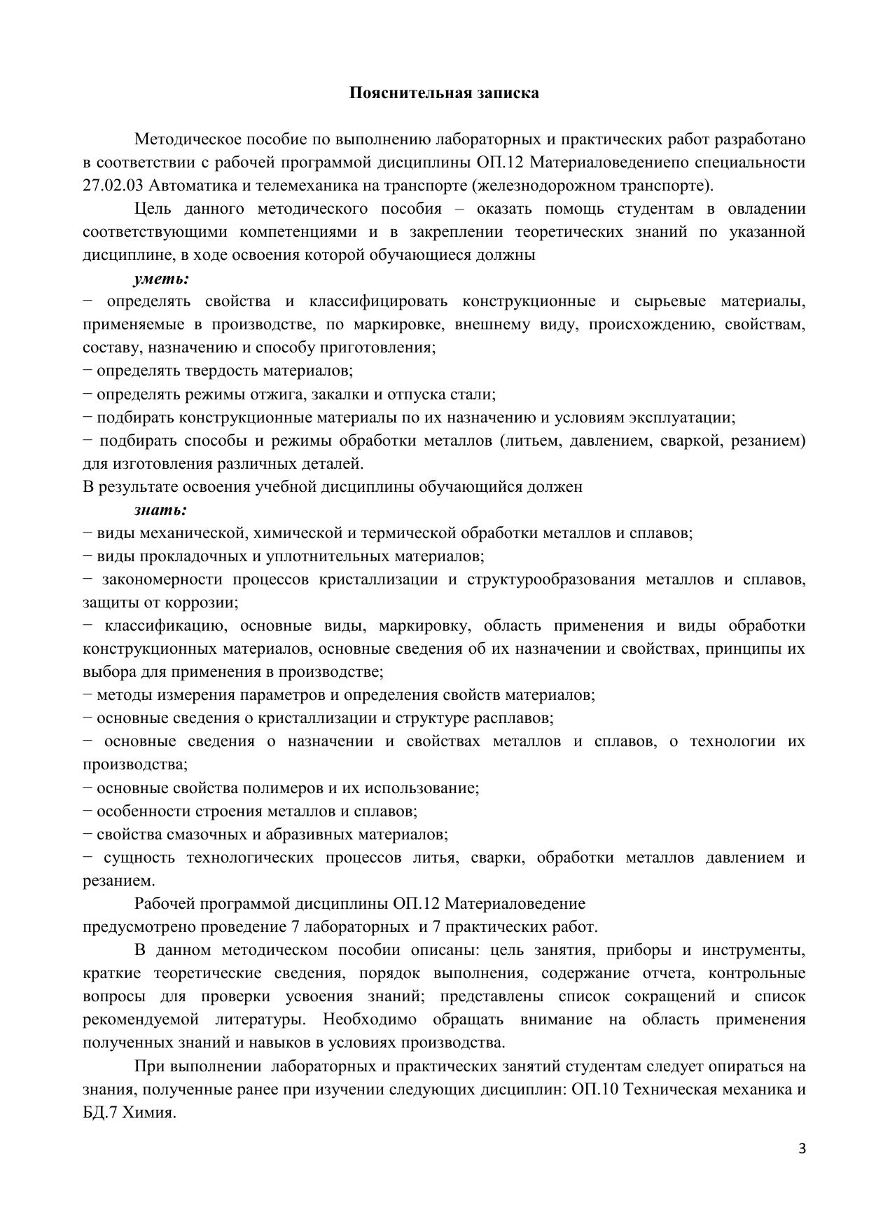 Методическое пособие по выполнению лабораторных и практических работ разработано в соответствии с рабочей программой дисциплины ОП.12 Материаловедениепо специальности 27.02.03 Автоматика и телемеханика на транспорте (железнодорожном транспорте).
