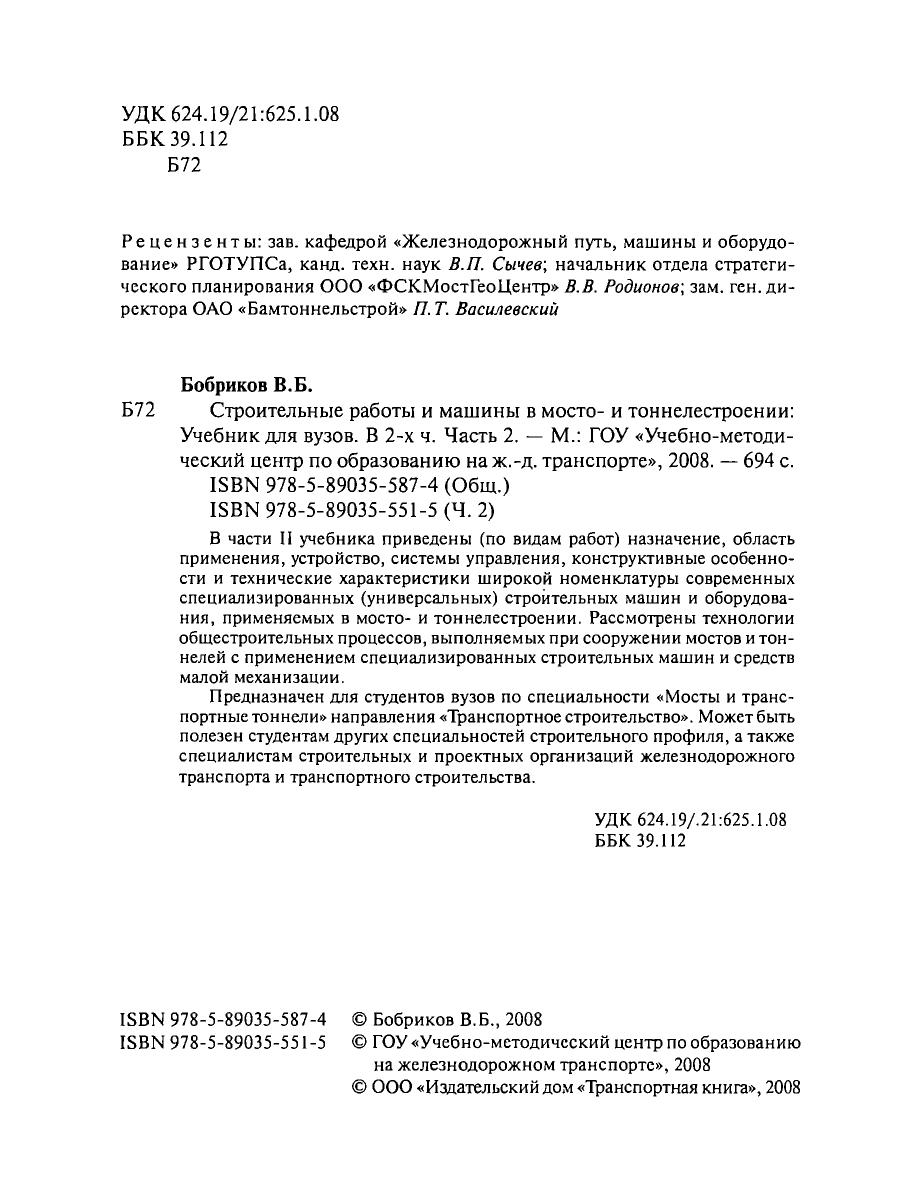 В части II учебника приведены (по видам работ) назначение, область применения, устройство, системы управления, конструктивные особенности и технические характеристики широкой номенклатуры современных специализированных (универсальных) строительных машин и оборудования, применяемых в мосто- и тоннелестроении. Рассмотрены технологии общестроительных процессов, выполняемых при сооружении мостов и тоннелей с применением специализированных строительных машин и средств малой механизации. Предназначен для студентов вузов по специальности «Мосты и транспортные тоннели» направления «Транспортное строительство». Может быть полезен студентам других специальностей строительного профиля, а также специалистам строительных и проектных организаций железнодорожного транспорта и транспортного строительства.