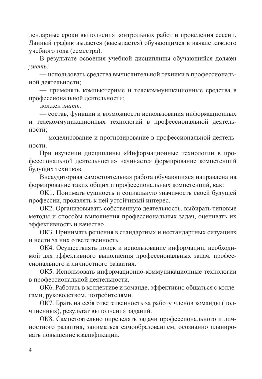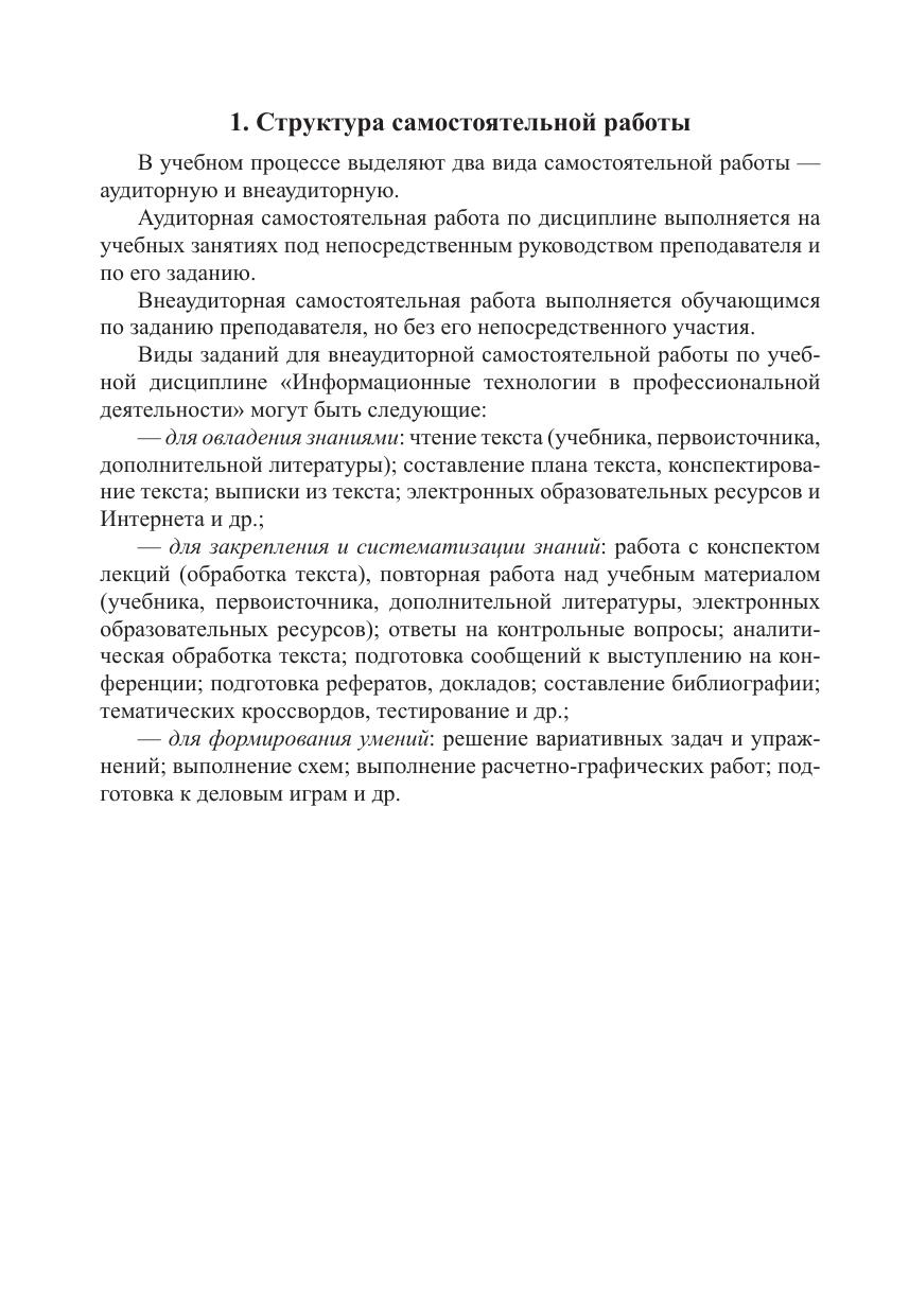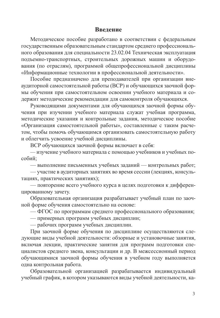 Методическое пособие разработано в соответствии с ФГОС СПО для специальности 23.02.04 Техническая эксплуатация подъемно-транспортных, строительных дорожных машин и оборудования (по отраслям), программой общепрофессиональной дисциплины «Информационные технологии в профессиональной деятельности». Пособие предназначено для преподавателей при организации внеаудиторной самостоятельной работы  и обучающихся заочной формы обучения при самостоятельном освоении учебного материала и содержит методические рекомендации для самоконтроля обучающихся.