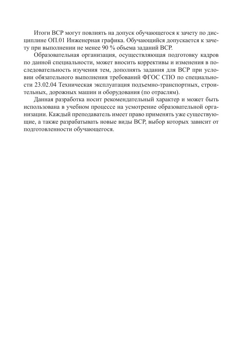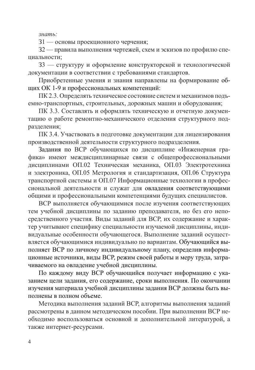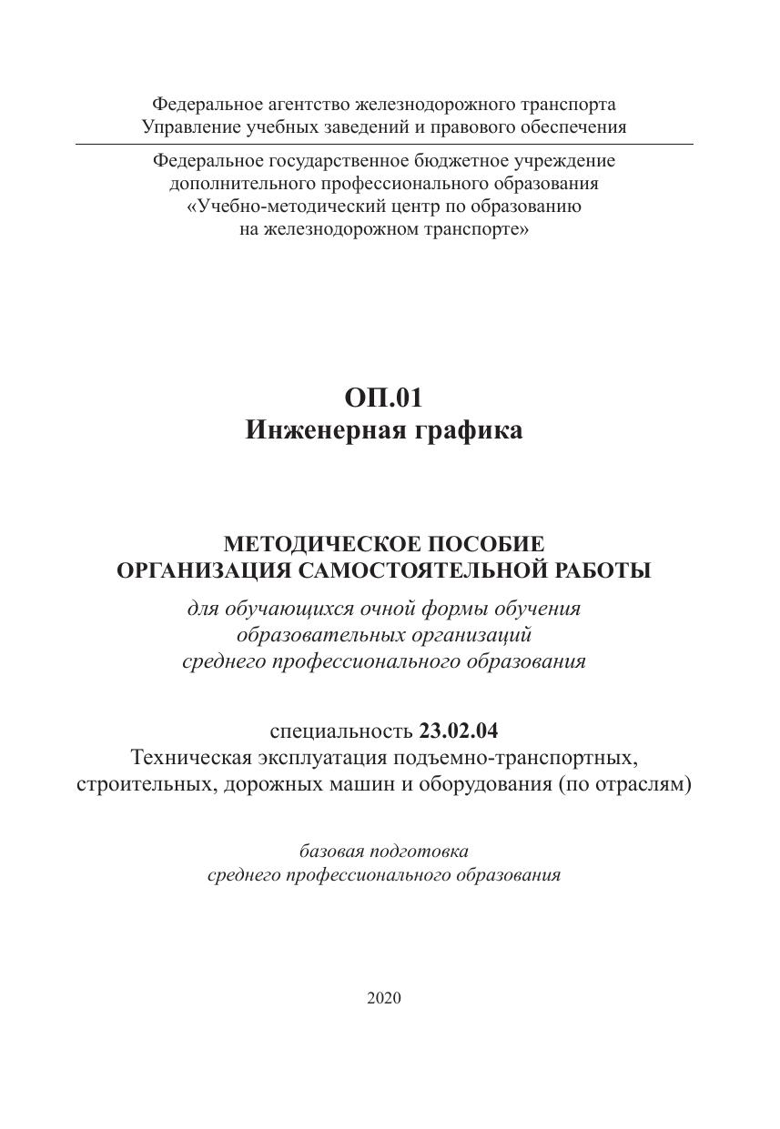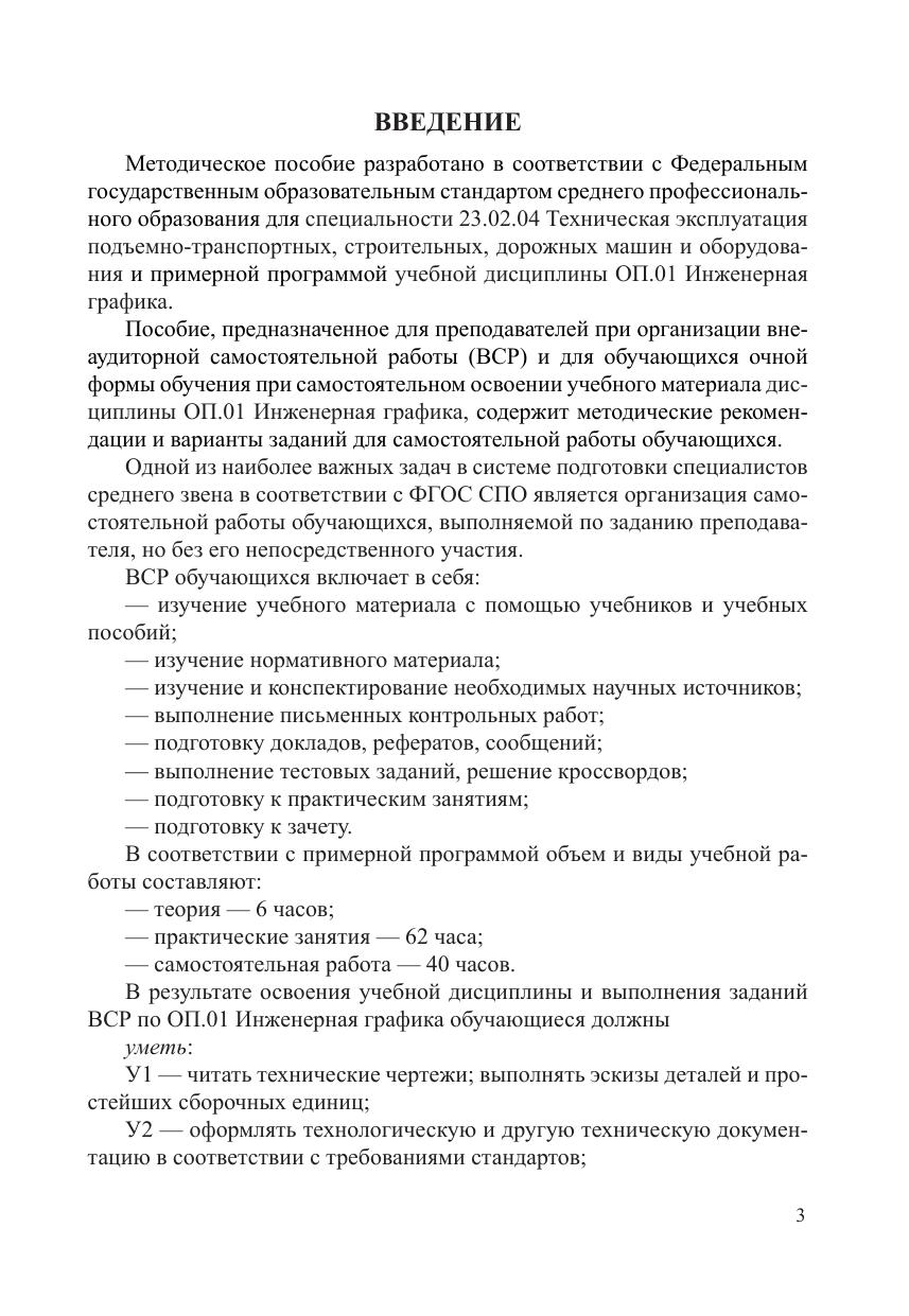 Методическое пособие разработано в соответствии с ФГОС  СПО для специальности 23.02.04 Техническая эксплуатация подъемно-транспортных, строительных, дорожных машин и оборудования и примерной рабочей программой учебной дисциплины ОП.01 Инженерная графика. Пособие предназначено для преподавателей при организации внеаудиторной самостоятельной работы  и для обучающихся очной формы обучения при самостоятельном освоении учебного материала дисциплины ОП.01 Инженерная графика. Содержит методические рекомендации и варианты заданий для самостоятельной работы обучающихся. В пособии рассмотрены методика и алгоритмы выполнения заданий.